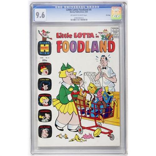<B>Little Lotta Foodland #4 File Copy (Harvey, 1964) CGC NM+ 9.6 Off-white to white pages.</B></I> Giant size issue. Only copy on the current CGC census. Overstreet 2007 NM- 9.2 value = $80. CGC census 1/08: 1 in 9.6, none higher.<BR><BR><b>Shipping:</b> Comics - Slabbed (certified) (<a target="_blank" href="http://www.heritageauctions.com/common/shipping.php">view shipping information</a>)