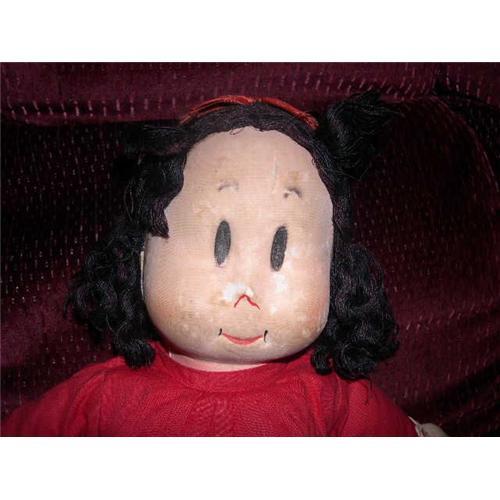 Little LuLu charcter doll made by Georgene Averill. This doll is 15" tall and has a molded face. She has been played with but still has her original one piece underwear and red dress. She even has her original red bow in her hair. She has her black yarn hair sewn to the black cotton head. There is some soil to the body so she is sold as is. She is from a smoke free environment. Buyer to pay $15 for shipping, insurance and handling. Thanks for viewing.