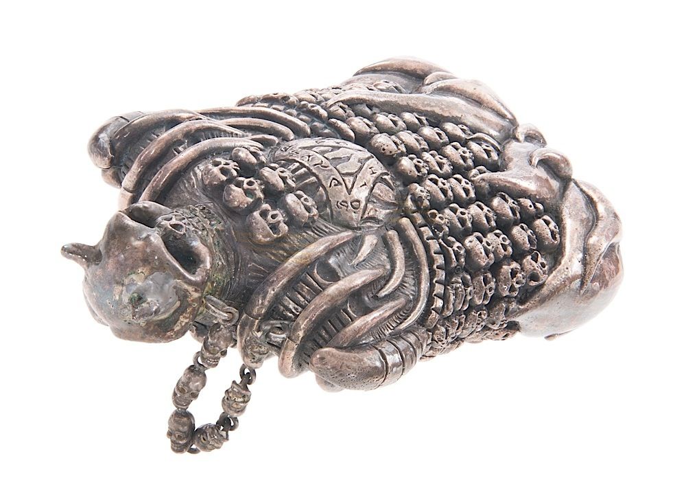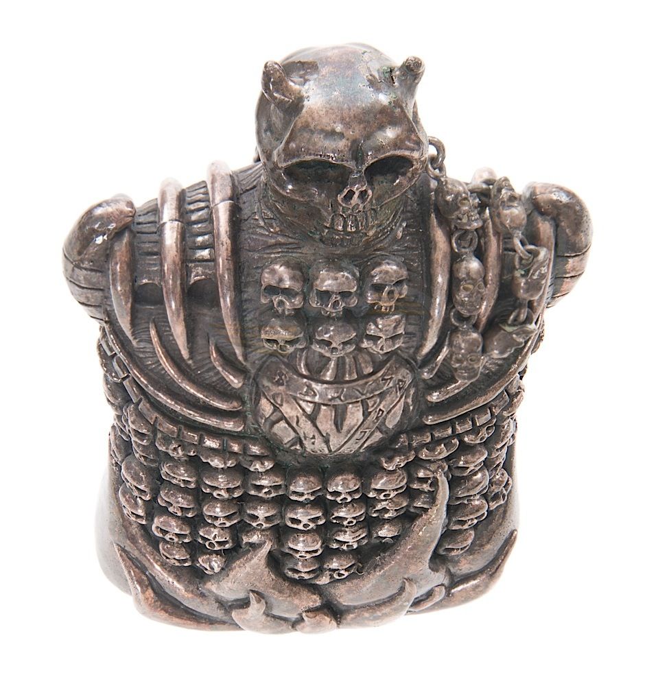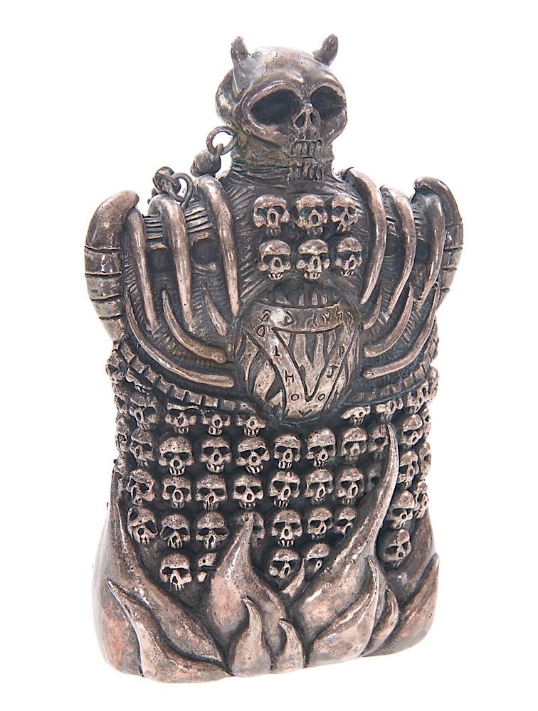 (New Line Cinema, 2000) This prop flask was custom-made by the production for use by various actors including Little Nicky (Adam Sandler). The flask is cast in solid resin and plated to look like metal. This flask is the smaller version that was used by the actors. Unlike the larger version used for insert shots, this smaller metal flask has a rough bottom and slightly different skull detailing than the larger version and fits easier in the actors' hands. Measures 6" x 4" x 2".