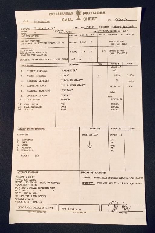 Original production call-sheet used in the Richard Benjamin directed neo noir thriller film 'Little Nikita' (1988), where an F.B.I. Agent works to uncover an All-American family as Soviet sleeper Agents, and gets caught up in friendship with their unaware son.