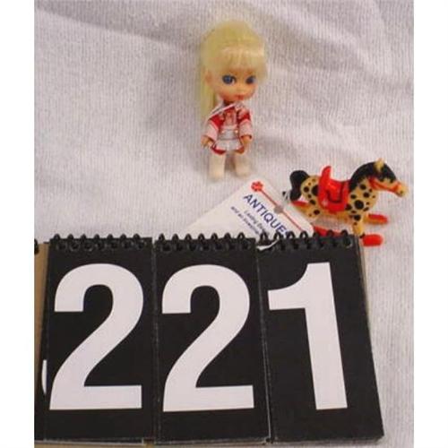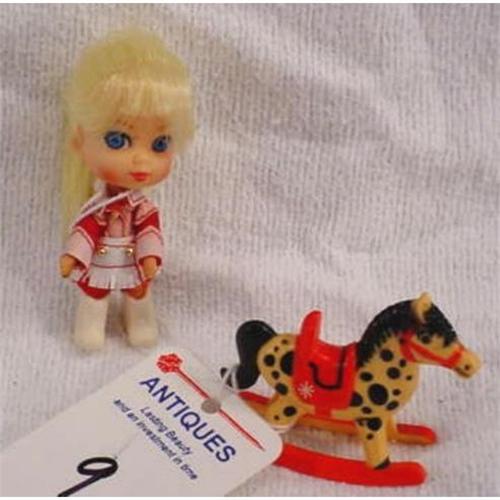 Little blond doll in cowgirl uniform and has a rocking horse. 3 inches tall and weighs 1 ounce. [196]