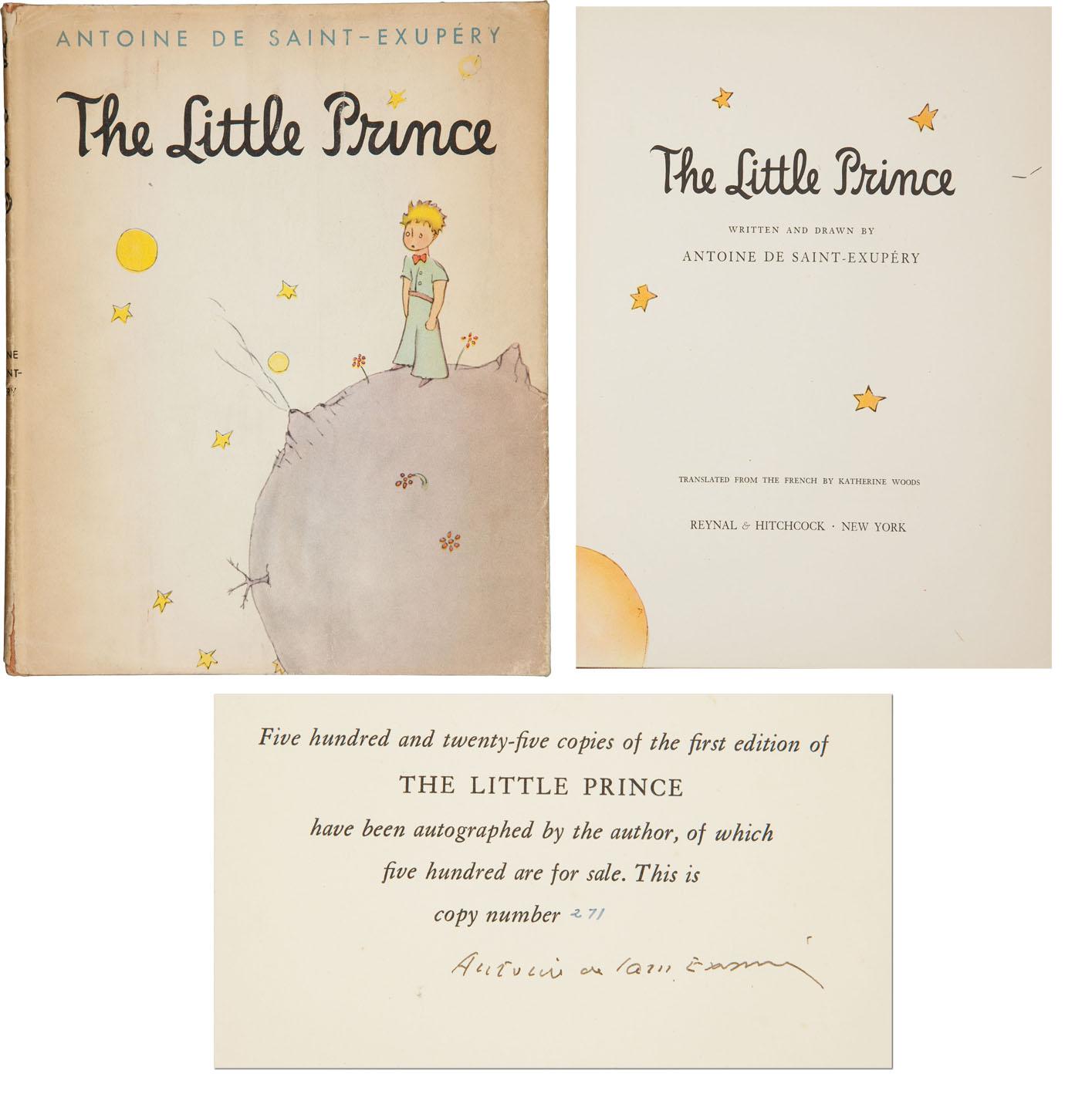One of only 525 limited edition signed copies of ''The Little Prince'' signed by the author and illustrator, Antoine de Saint-Exupery. First edition, published by Reynal & Hitchcock: New York: 1943. First edition signed copies are limited to 525 copies, of which this is number 271. In publisher's red-stamped salmon cloth boards. Very minor foxing to limitation page and shallow crease to the bottom corner of the last three leaves. In the first issue dustjacket, with ''$2.00'' on front flap; small chips to spine ends, darkened spine and minor toning to front and rear panels. A near fine copy, housed in a custom gray cloth clamshell box.
