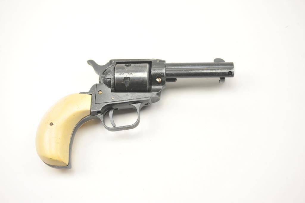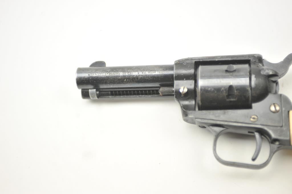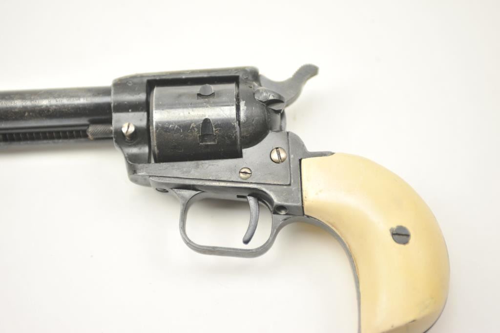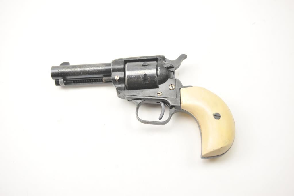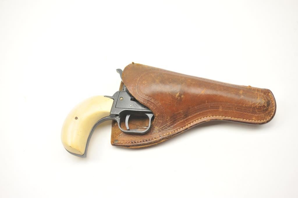 Little Ranger SA revolver, .22 L.R. caliber, Serial #IB02387. The pistol is in good overall with a 3 ½” barrel. The pistol retains a significant amount of flaking blue finish with numerous mars, scratches anddings. The faux ivory bird head grips are in good condition and fit well. The action functions and the bore is fair. The lot includes an older, hand tooled leather open top holster in good condition. The lotincludes a letter from Caravan West Production indicating that this pistol was used in various television shows and films including Wild West Tech and The Last Shot. Est.: $300-$600. (Modern).