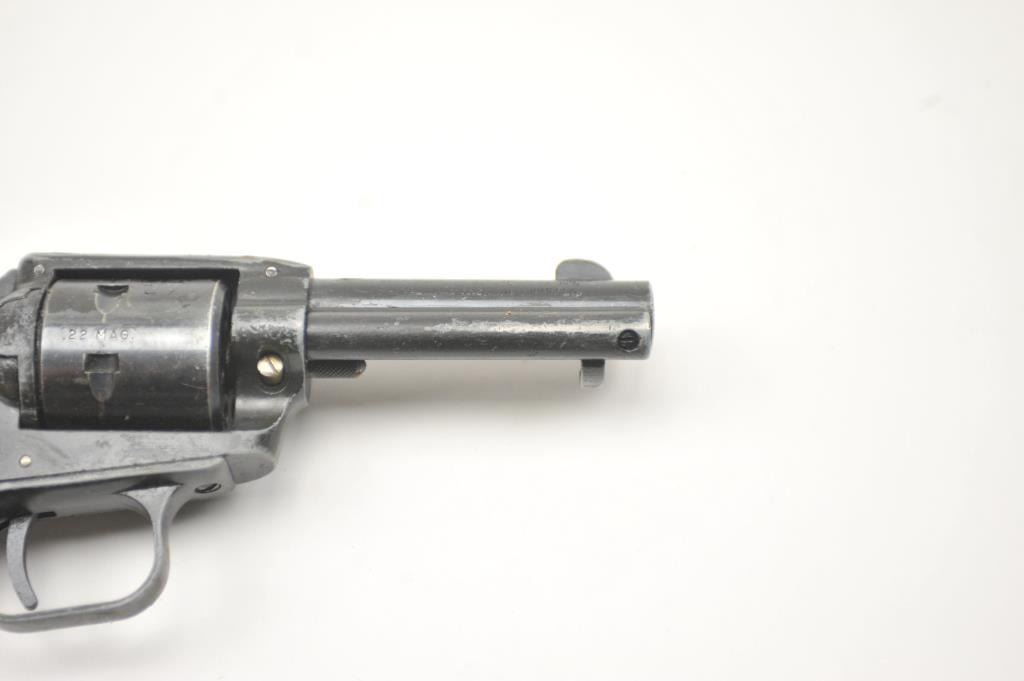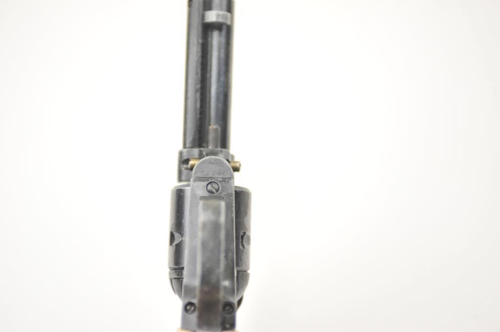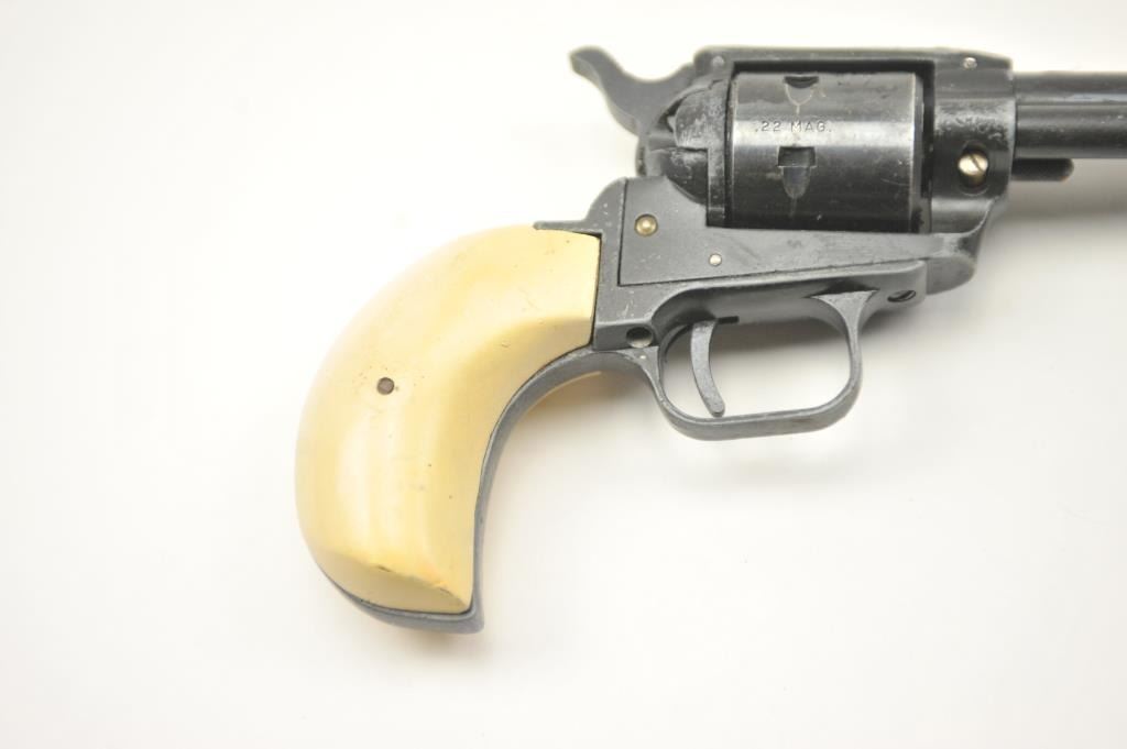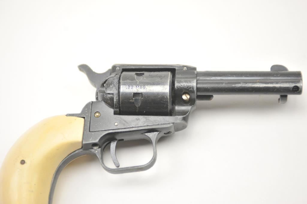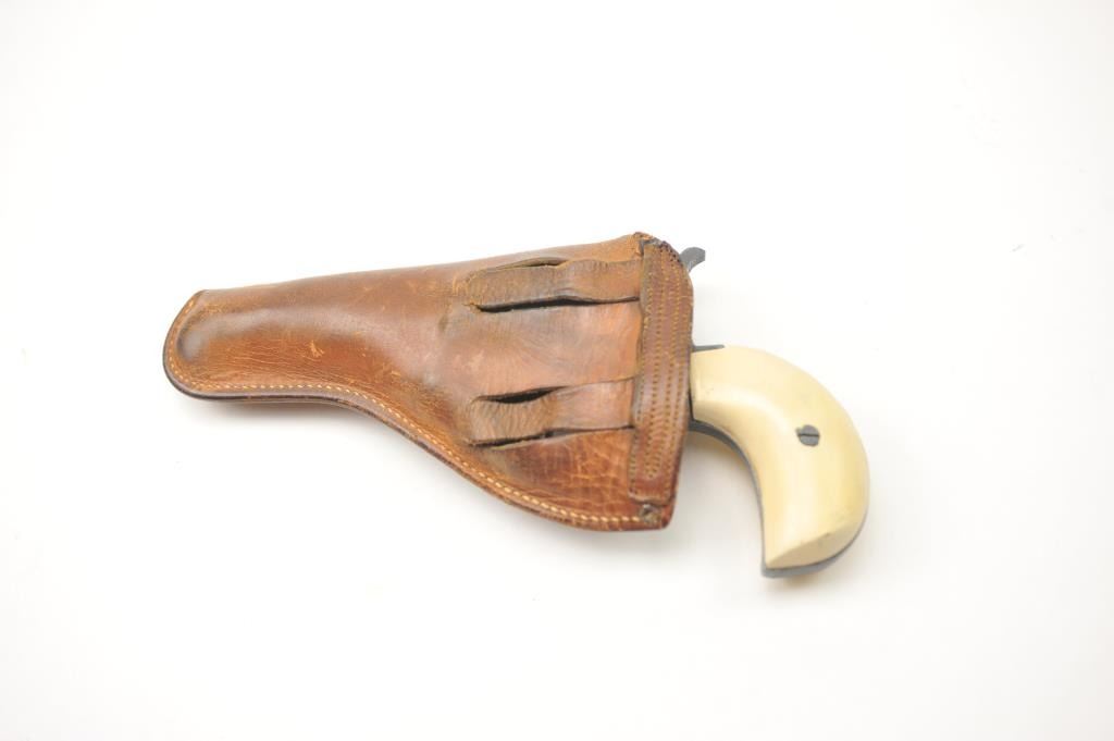 Little Ranger SA revolver, .22 L.R. caliber, Serial #IB02387. The pistol is in good overall with a 3 ½” barrel. The pistol retains a significant amount of flaking blue finish with numerous mars, scratches anddings. The faux ivory bird head grips are in good condition and fit well. The action functions and the bore is fair. The lot includes an older, hand tooled leather open top holster in good condition. The lotincludes a letter from Caravan West Production indicating that this pistol was used in various television shows and films including Wild West Tech and The Last Shot. Est.: $300-$600. (Modern).