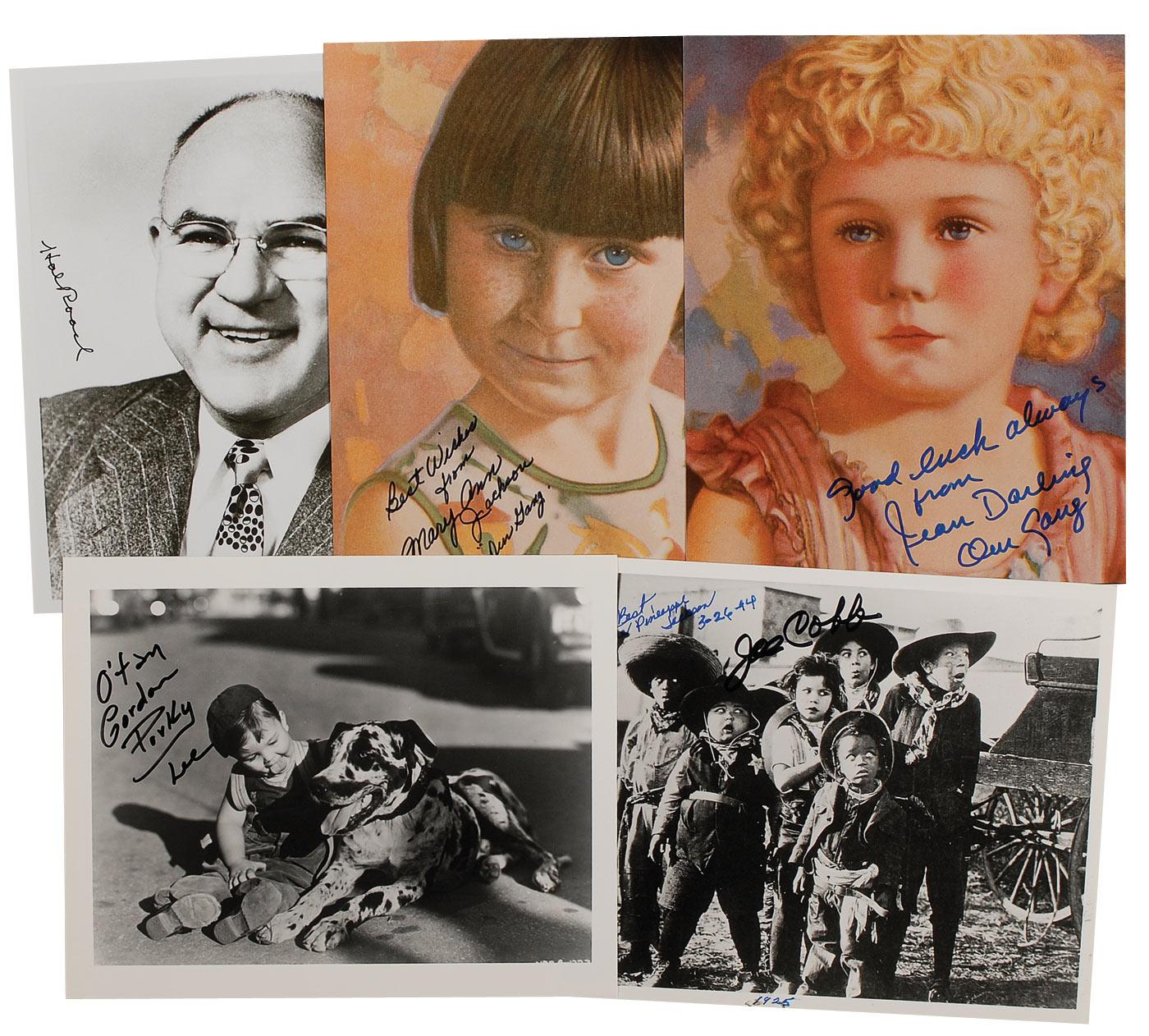 Five signed glossy photos (two colorized), three 8 x 10 and two 10 x 8, each signed in felt tip by the respective star pictured. Signers are: Hal Roach, Gordon ‘Porky’ Lee, Jean Darling, Mary Ann Jackson, and Eugene ‘Pineapple’ Jackson and Joe Cobb. A few have added a brief sentiment. In overall fine condition.