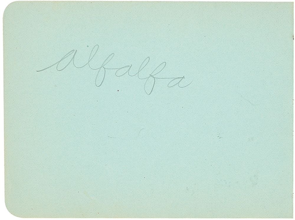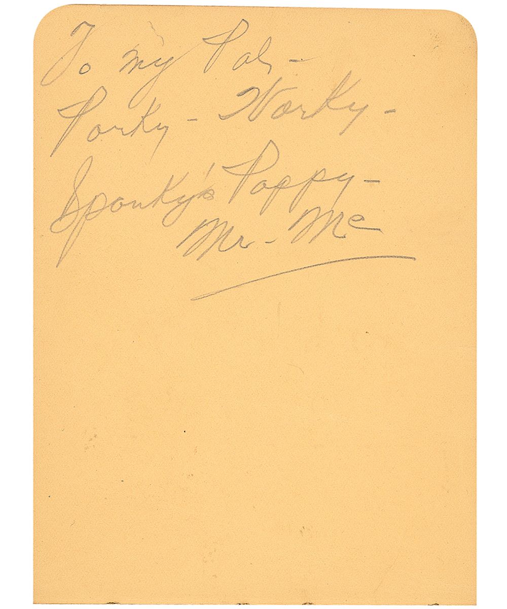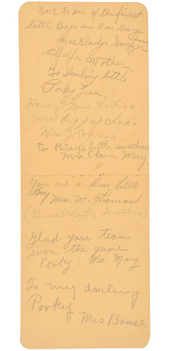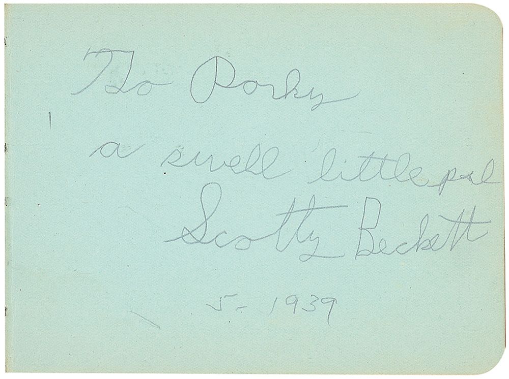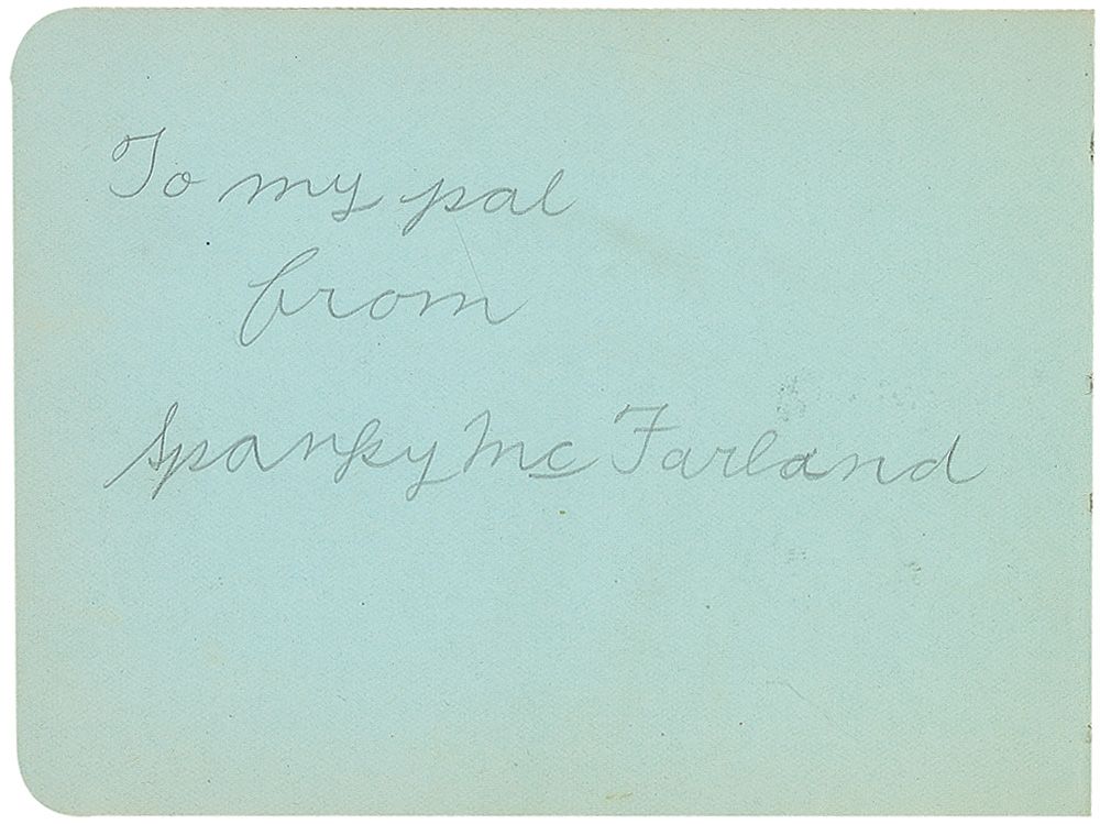 Gordon ‘Porky’ Lee’s personal hardcover auotgraph album, 5.25 x 4.25, signed inside in pencil and fountain pen by approximately 130 friends and co-workers, with many adding inscriptions, with some multi-page signatures, as well as many signatures back to back. Highlights include a pencil signature and inscription, “To my pal from Spanky McFarland,” a pencil signature “Alfalfa,” and a pencil signature and inscription, “To Porky, A swell little pal, Scotty Beckett, 5–1939.” Other signers include Gordon Douglas, Fern Carter, Rosina Laurence, Hal Roach, Jr., Spanky’s father, and the mothers of Alfalfa, Buckwheat, and Darla. Many of the signatures at the beginning appear to be addresses of friends in Oklahoma City. In very good to fine condition, with a few loose pages, some mild toning, binding a bit loose, and a few signatures a bit light. Accompanied by a letter of authenticity from Disney’s MGM Studios. A great personal item from the obviously well-liked cast member.