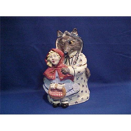 This is a very cute Cookie Jar showing the big bad Wolf holding Little Red Riding Hood . It is in Great condition , no chip's or crack's and the paint is very good . It was made by Rick Wisecarver in the 1991 , numbered # 50 . A super Piece to add to Your collection .