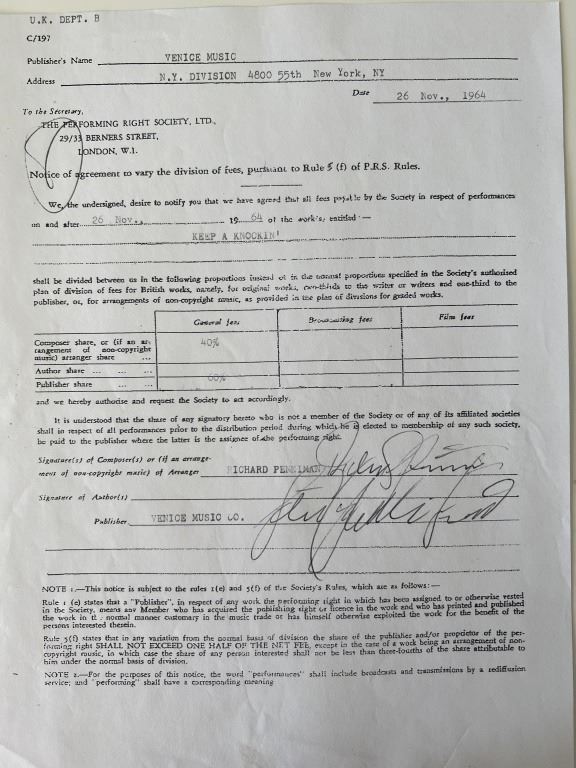 Little Richard signed Venice Music contract. 26, November, 1964. 9x12 inches. DB620