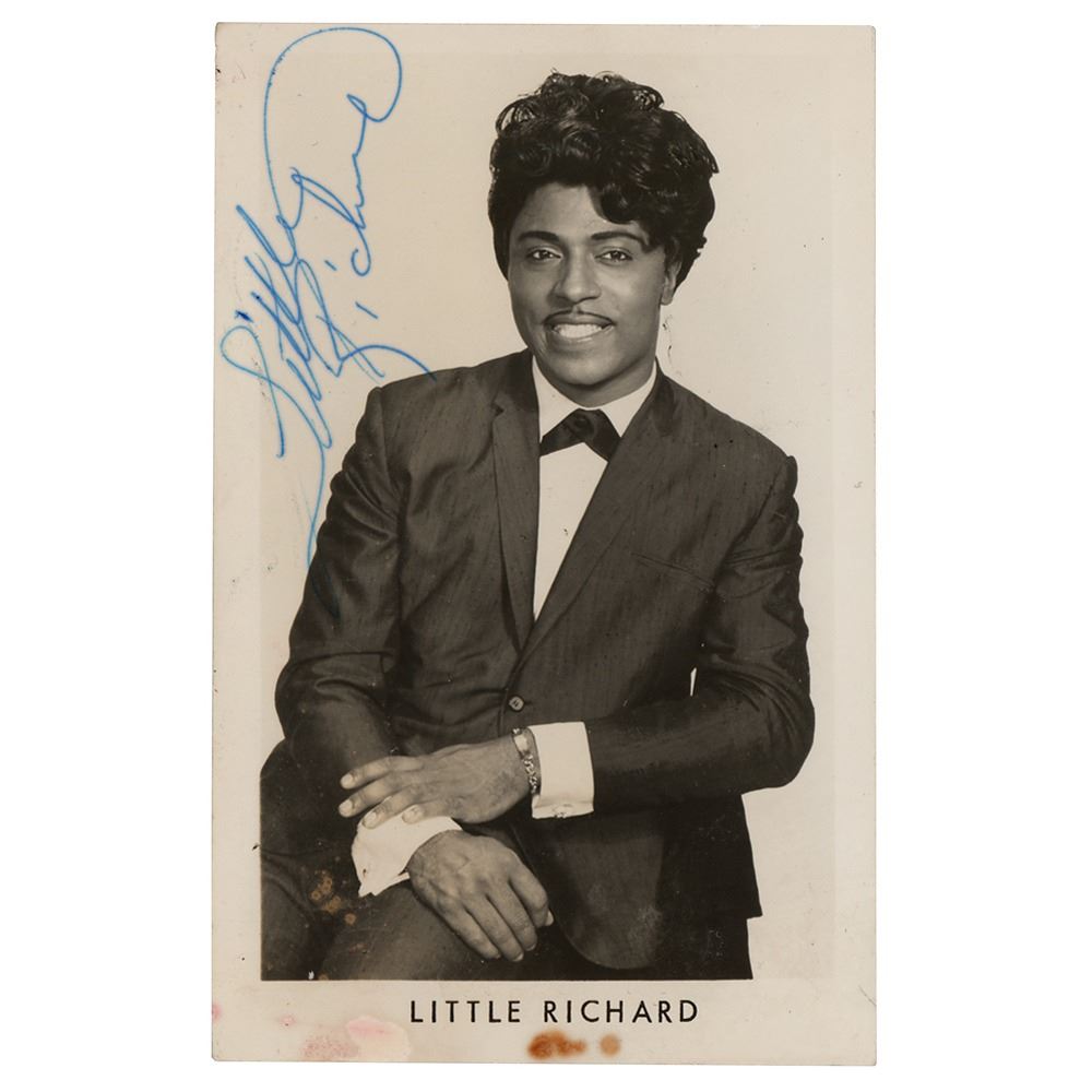Vintage semi-glossy 3.5 x 5.5 promotional postcard of Little Richard, signed vertically in blue ballpoint. The consignor notes that the signature dates to the 1960s. In very good to fine condition, with a faint diagonal bend to the left side, and small stains to the bottom. Accompanied by a certificate of authenticity from Tracks.