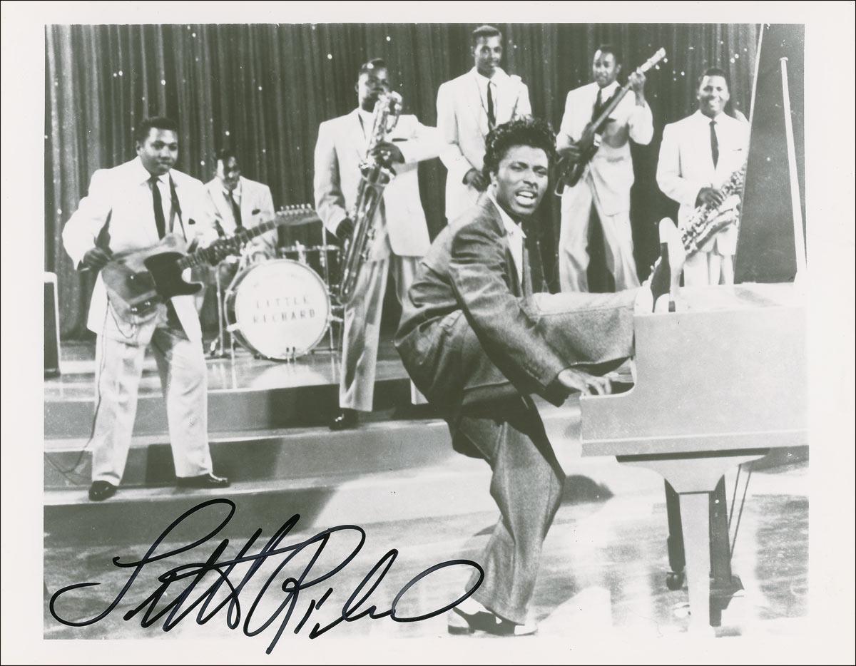 Glossy 14 x 11 photo of a young Richard playing his piano on one leg, signed in-person in black felt tip. In very fine condition. Originally obtained by in-person specialist Mike Wehrmann.