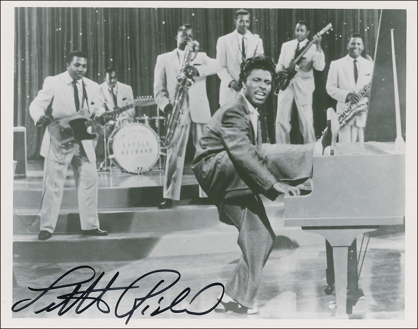 Glossy 10 x 8 photo of a young Richard playing his piano on one leg, signed in-person in black felt tip. In very fine condition. Originally obtained by in-person specialist Mike Wehrmann.