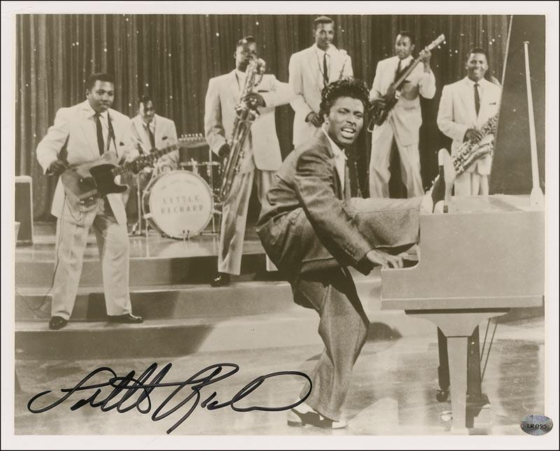 Glossy 10 x 8 photo of a young Richard playing his piano on one leg, signed in black felt tip. In fine condition, with an authentication label affixed to lower corner.