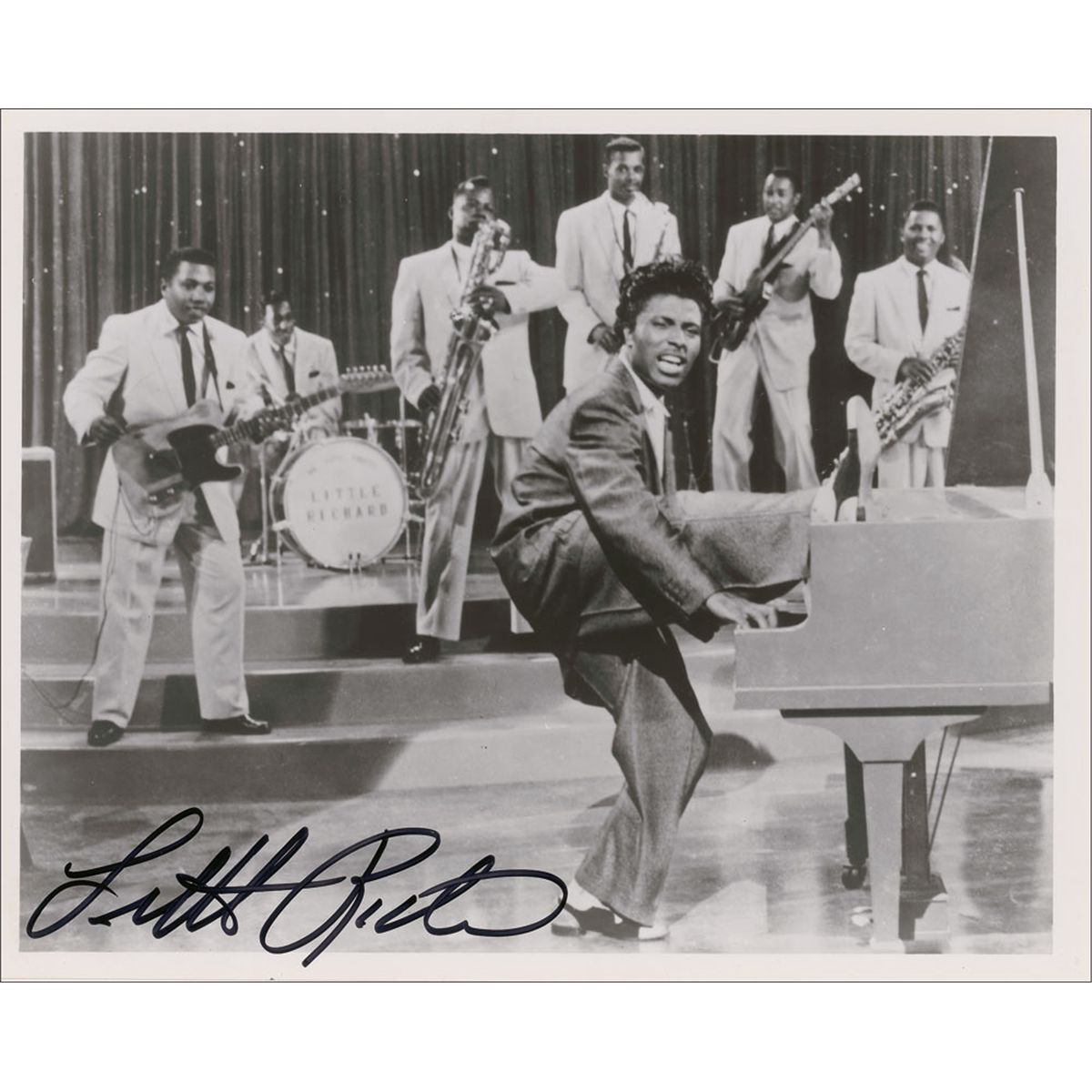 Glossy 10 x 8 photo of a young Richard playing his piano on one leg, signed in-person in black felt tip. In fine condition. Originally obtained by in-person specialist Mike Wehrmann.