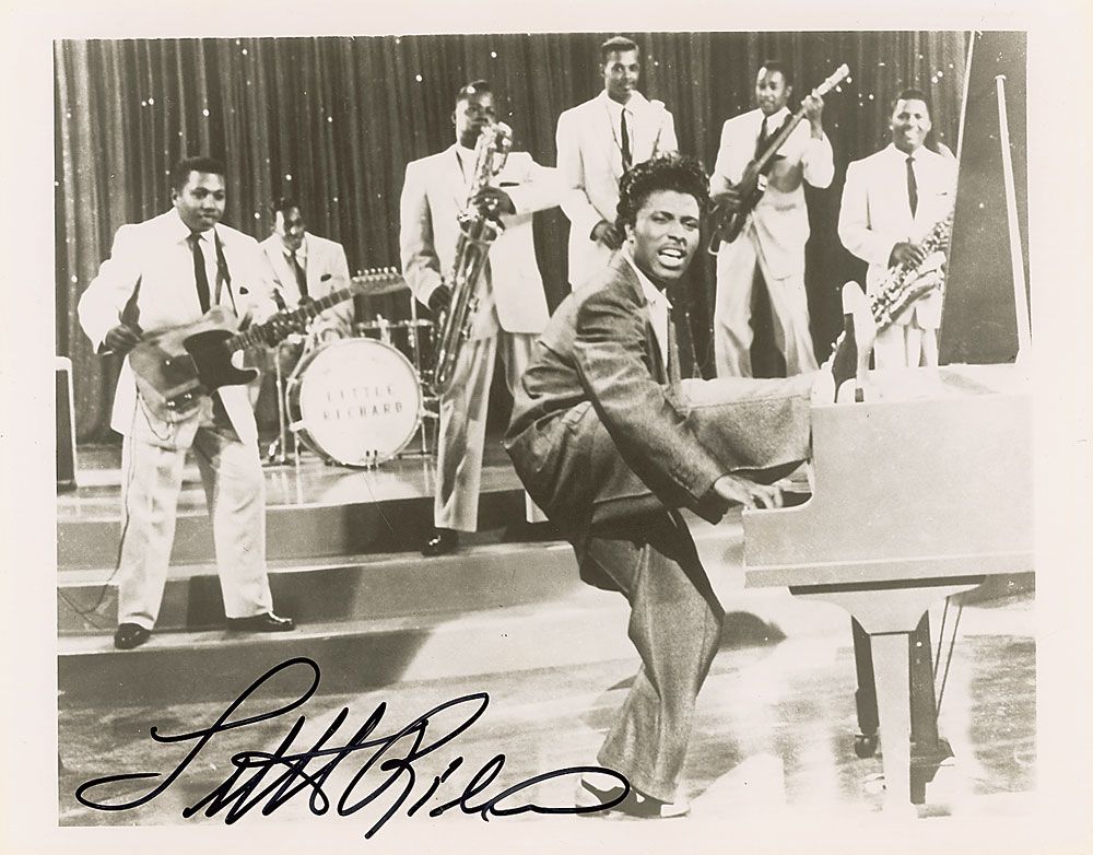 Glossy 14 x 11 photo of Little Richard demonstrating his flexibility on stage, signed in black felt tip. In fine condition. Originally obtained through a private signing arranged by in-person specialist Mike Wehrmann. Accompanied by a certificate of authenticity from Roger Epperson/REAL.