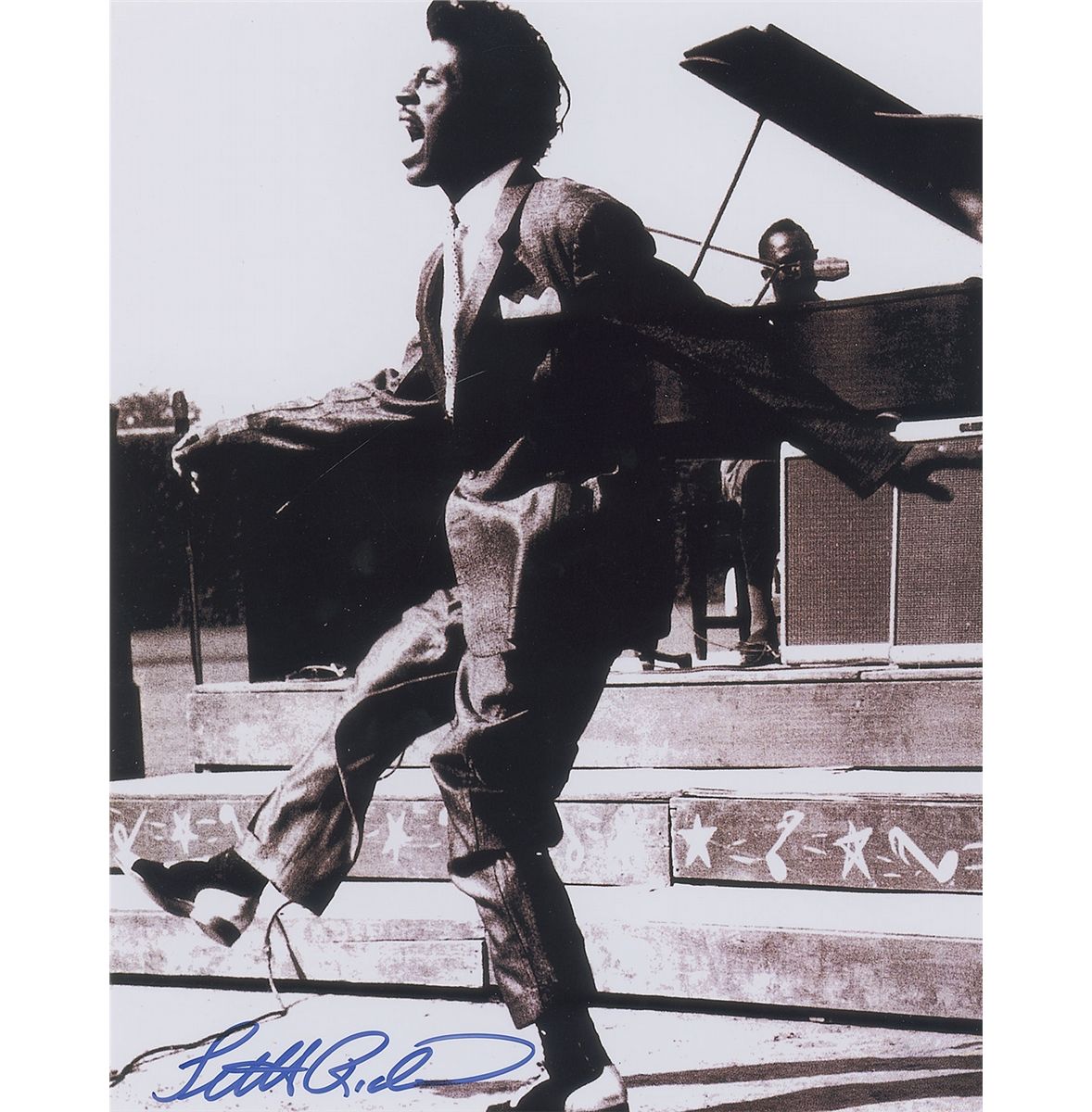 Glossy 11 x 14 photo of a young Little Richard kicking his heels up on stage, signed in black felt tip. In very fine condition.