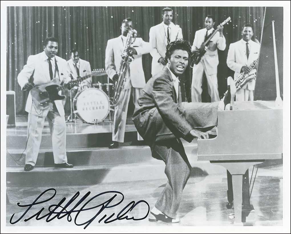 Color glossy 10 x 8 photo of a young Richard playing his piano on one leg, signed in black felt tip. Originally obtained by in-person specialist Mike Wehrmann. In very fine condition.