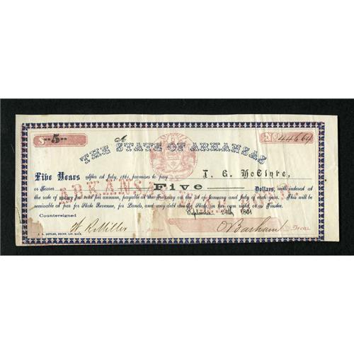 <B>Little Rock, AR- State of Arkansas</B></I> $5 Bond July 1, 1861 61J2<BR>This bond exhibits embossing and some staining along the bottom edge. The left edge has an approximate one inch repair. <B>Fine-Very Fine.</B></I><BR><BR><b>Shipping:</b> Coins & Currency (<a target="_blank" href="http://www.heritageauctions.com/common/shipping.php">view shipping information</a>)