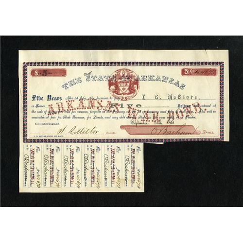 <B>Little Rock, AR- State of Arkansas</B></I> $5 Sept. 24, 1861<BR>This attractive issue is made out to J.G. McClure for $5. The bottom of the certificate shows six of ten interest coupons remaining. The were redeemable for 20 in interest and payable every six months. The colors on this issue are exceptional with deep reds complementing deep blues. <B>Choice About Uncirculated.</B></I><BR><I>From The Jacob and Heather Dedman Collection</B></I><BR><BR><b>Shipping:</b> Coins & Currency (<a target="_blank" href="http://www.heritageauctions.com/common/shipping.php">view shipping information</a>)