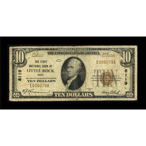 <B>Little Rock, IA</B></I> - $10 1929 Ty. 1 <B>The First NB</B></I> Ch. # 8119<BR> This is one of only 8 small notes documented from the sole issuer in town. The last time a Series 1929 note appeared at auction on this bank was in 2003. <B>Very Good</B></I>.<BR><BR><b>Shipping:</b> Coins & Currency (<a target="_blank" href="http://www.heritageauctions.com/common/shipping.php">view shipping information</a>)