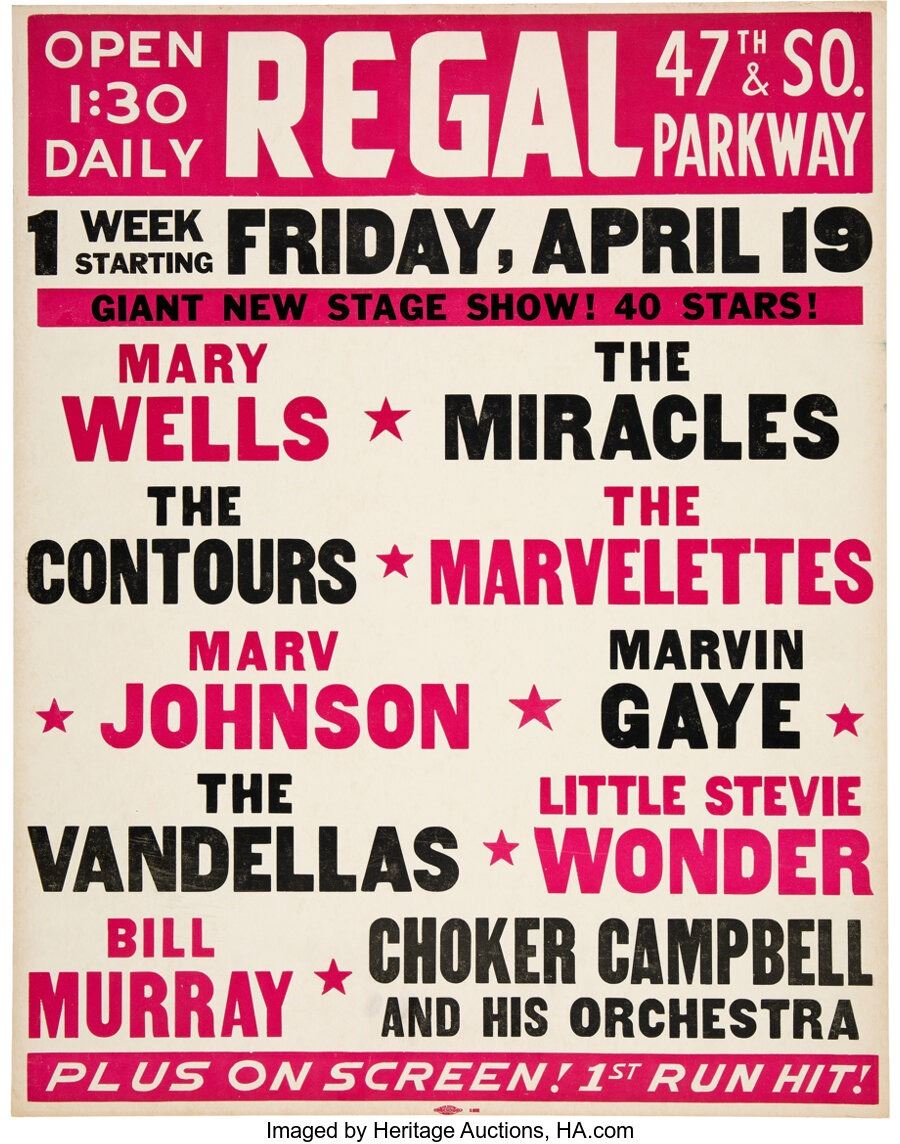 Little Stevie Wonder, Marvin Gaye, Miracles, Mary Wells 1963 Motortown Revue Concert Poster.An original vintage 1963 jumbo cardboard window card advertising all of the Motown Records musicians who would participate in the label's famous "Motortown Revue" concert tours of the early 60's. This was for all of Motown's finest in concert for a week in the spring of 1963 at Chicago's famed Regal Theatre. Appearing were the first queen of Motown, Mary Wells, The Miracles with Smokey Robinson, The Contours, The Marvelettes, Motown co-creator Marv Johnson, the inimitable Marvin Gaye, The Vandellas before Martha's name was broken out, and 12-year-old Little Stevie Wonder one month before his "Fingertips Pt. 1" single was released and made him a star. So yes, that marks this as the earliest known Stevie Wonder concert poster as well.
