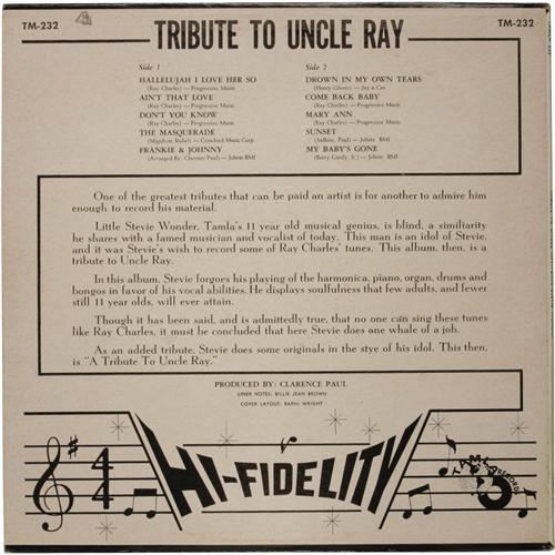 <B>Little Stevie Wonder "Tribute to Uncle Ray" Promo LP (Tamla 232, 1963).</B></I> Near Mint copy of Wonder's first album, and it's a white label promo! The earliest Ray Charles tribute album? Condition: NM 8/ NM 8.<BR><BR><b>Shipping:</b> Recordings (<a target="_blank" href="http://www.heritageauctions.com/common/shipping.php">view shipping information</a>)