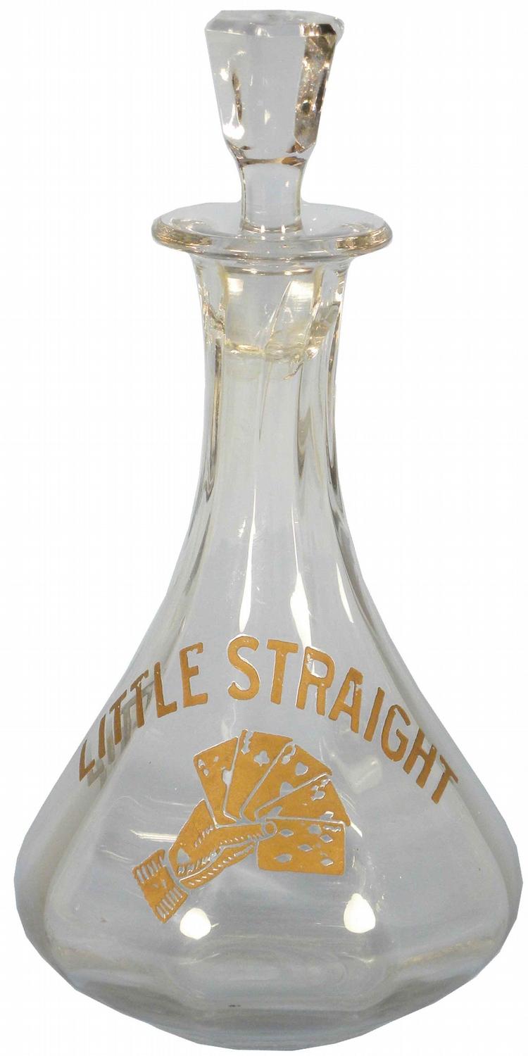 "Little Straight" Back Bar Bottle. Gold filled etched with gambling motif. No chips or cracks. 9 3/4 inches tall.