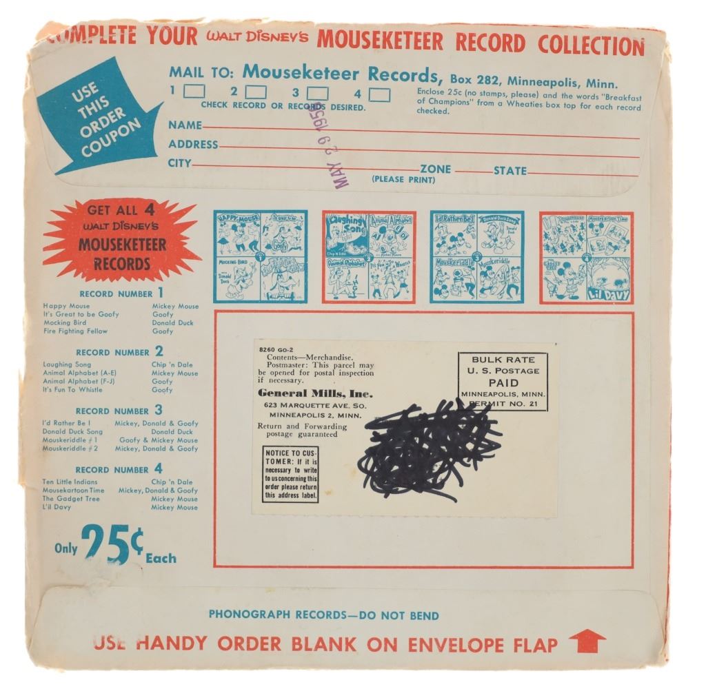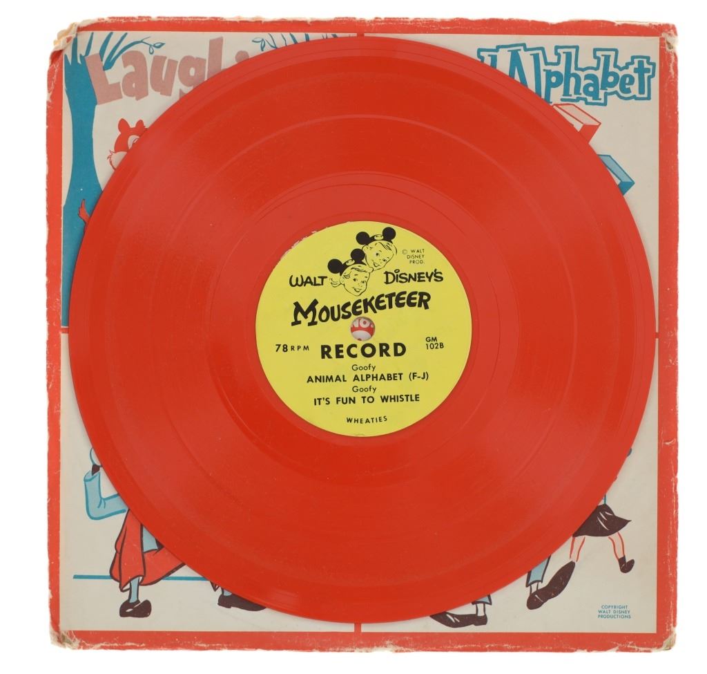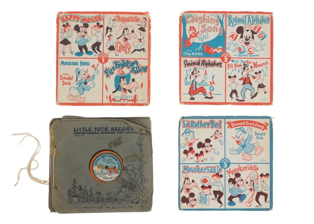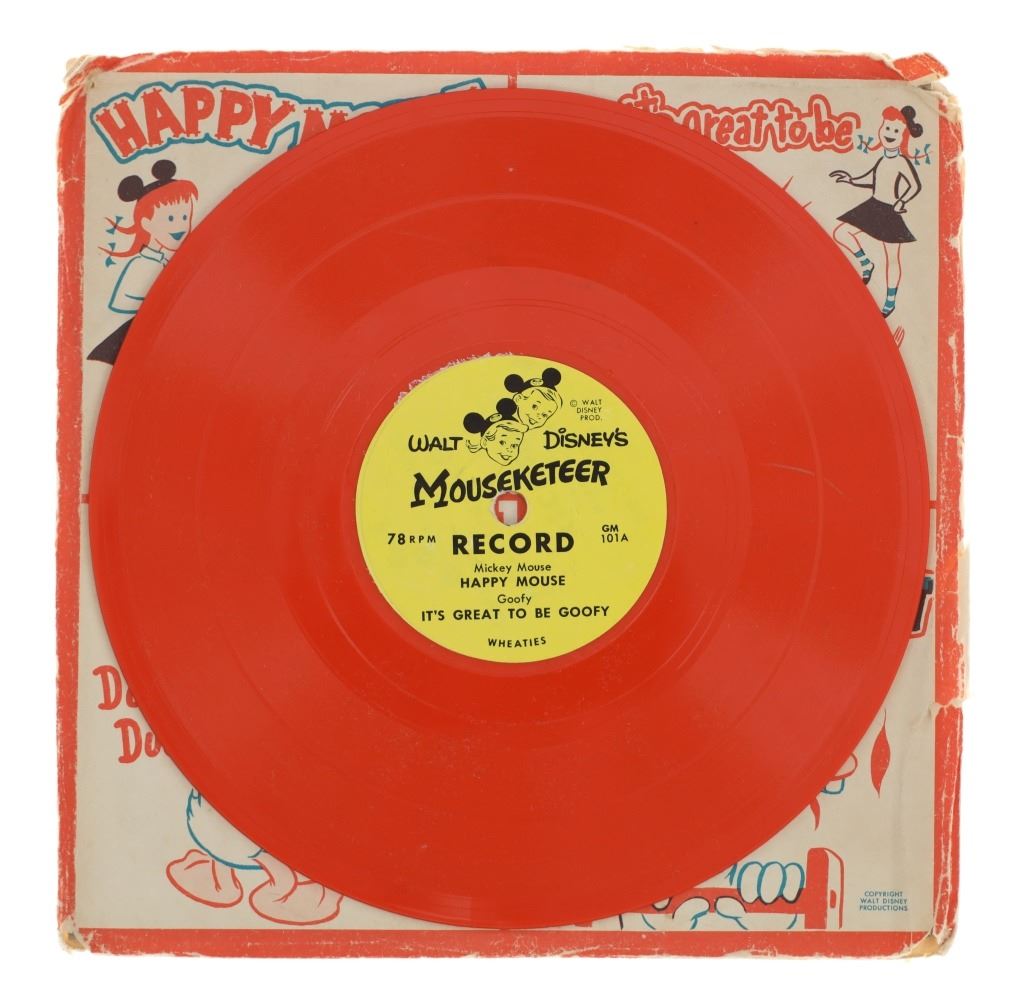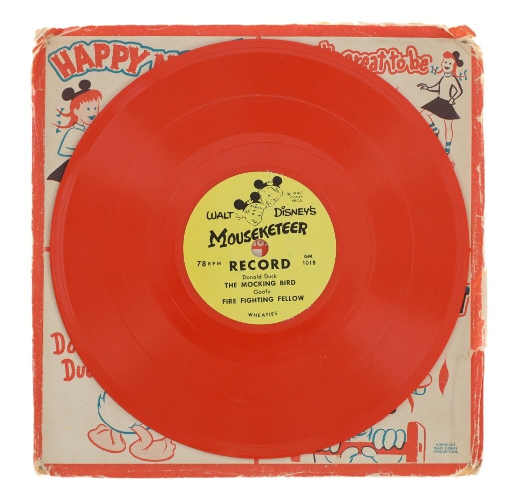 For your consideration are these 1950-60s Little Tots' & Walt Disney's Mouseketeer 45 RPM records. The Little Tots' Nursery Tunes include seven 45 RPM records, with each including two songs, one on each side. The records were made by The Regal Record Company Incorporated in New York. Some of the songs include "Rock-A-Bye Baby", "Mary Had A Little Lamb", "Jack And Jill", "Little Bo-Peep" and more. The records come in their original slipcases and are bound by twine. The slipcases read "Little Tots' Records / Songs, Games, Stories--For Kiddies" at the top and show a little girl water plants and flowers at the bottom. The next group of records are the Walt Disney's Mouseketeer 45 RPM Records distributed by General Mills Incorporated and only obtainable through a mail-in order with Wheaties circa 1956. The records are numbered 1 through three, the fourth is missing from the collection. Each record is a bright orange color and features an A and B side featuring two songs on each side. The slipcases show brightly colored graphics of Mickey Mouse, Donald Duck and Goofy along with the song titles. Overall the records show good condition with little wear to the records themselves. The slipcases show wear from their age and use over the years. The records have not been tested for quality. The records in the slipcases measure approximately 7 1/2" L x 7 3/8" W. The collective weight of all the records is approximately 1 pounds and 12 ounces.