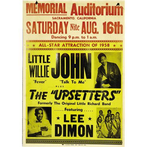 <B>Little Willie John and the Upsetters Concert Poster (1958).</B></I> Poster for an August 16, 1958 show featuring Little Willie John plus the Upsetters (Little Richard's original backing band). Overall in Good condition, with minor warping from storage, several sets of staple holes, and a few noticeable tears.