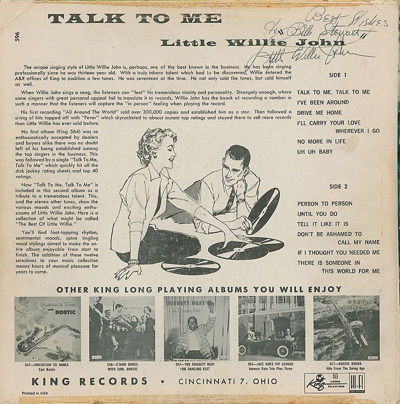 R & B singer (1937–1968) who was convicted of manslaughter in 1966 and died in prison two years later. Talk to Me album signed and inscribed on the back cover in black ballpoint, “Best wishes to Bill Stewart, Little Willie John.” In very good condition, with completely separated top and bottom edges of front cover, scattered edge wear and creases, and tape remnants to horizontal edges of covers. The record is included. An extremely rare signature of the 1996 Rock and Roll Hall Fame inductee, whose mysterious death in prison remains unsolved, and whose influence upon fellow soul singers has been profound.