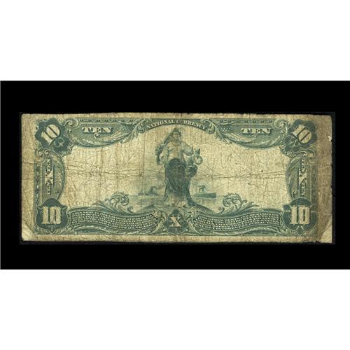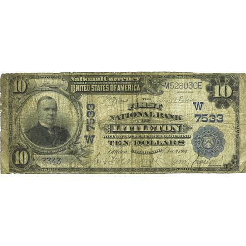 <B>Littleton, CO</B></I> - $10 1902 Plain Back Fr. 624 <B>The First NB</B></I> Ch. # (W)7533<BR>This community is right outside Denver and is now a popular destination for transplants to Colorado. As such, the popularity of notes from this locale has increased, but the supply is still paltry at best. As a new piece to the census, the total large size survivors now rests at four. The other three reported notes are also heavily circulated. We are pleased to see the signatures on this note remain strong and legible. <B>Very Good,</B></I> with a few paper splits that should be noted for accuracy.