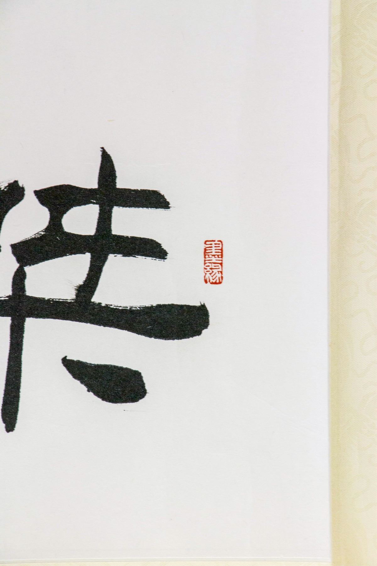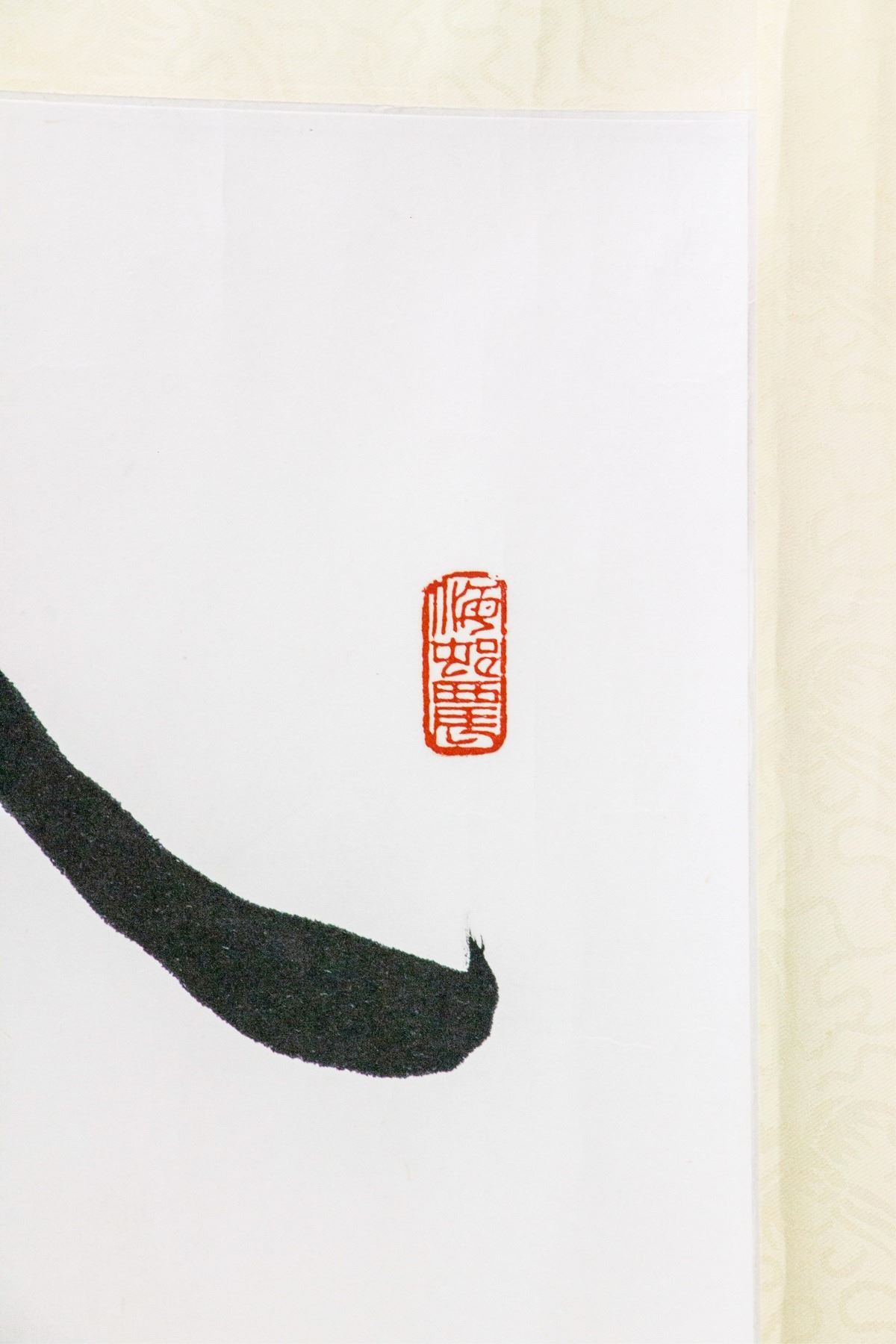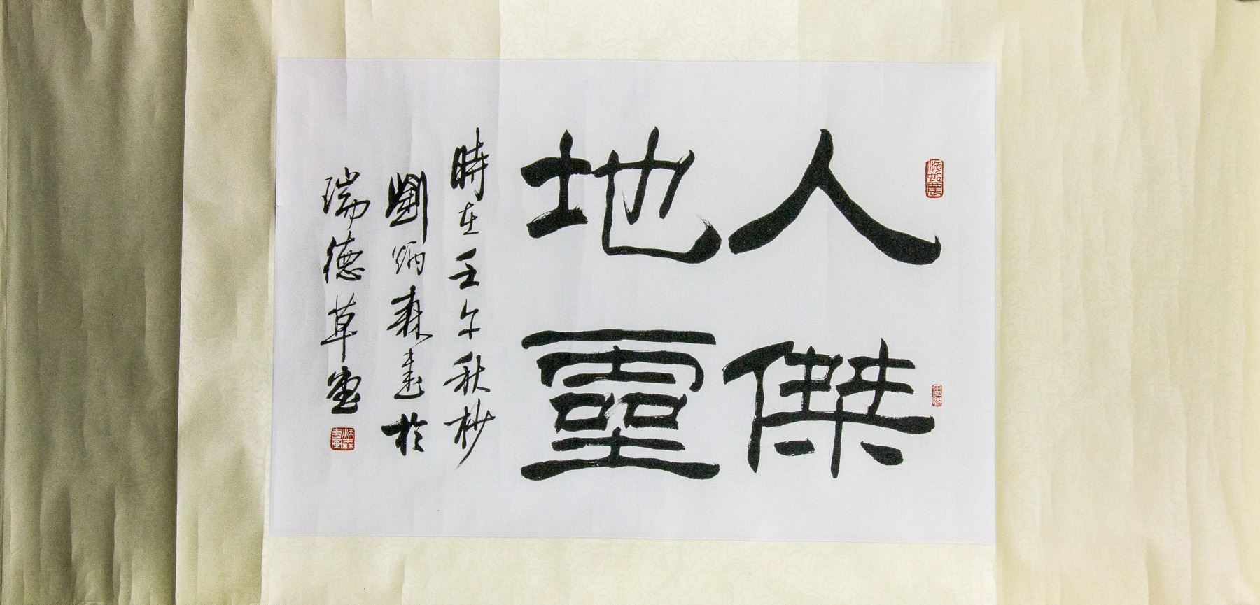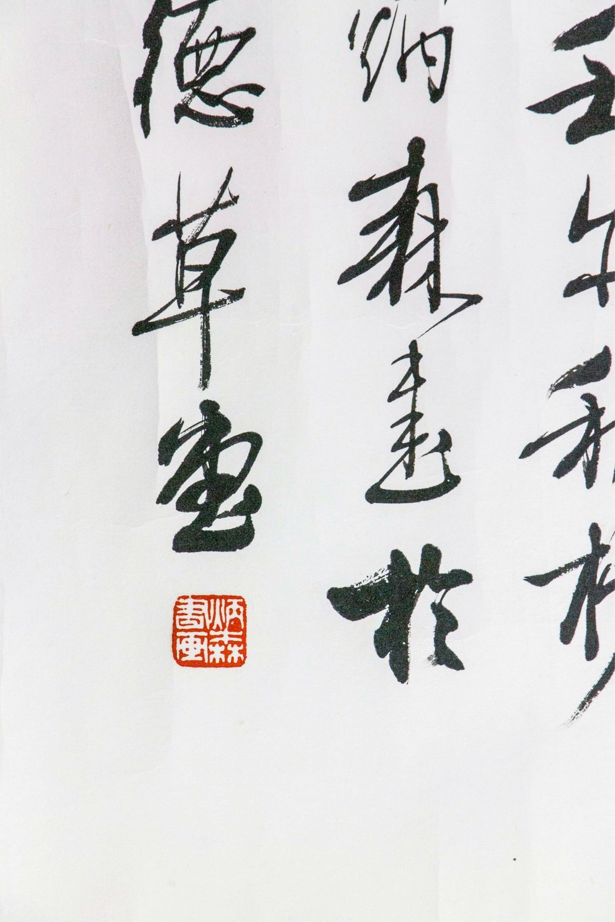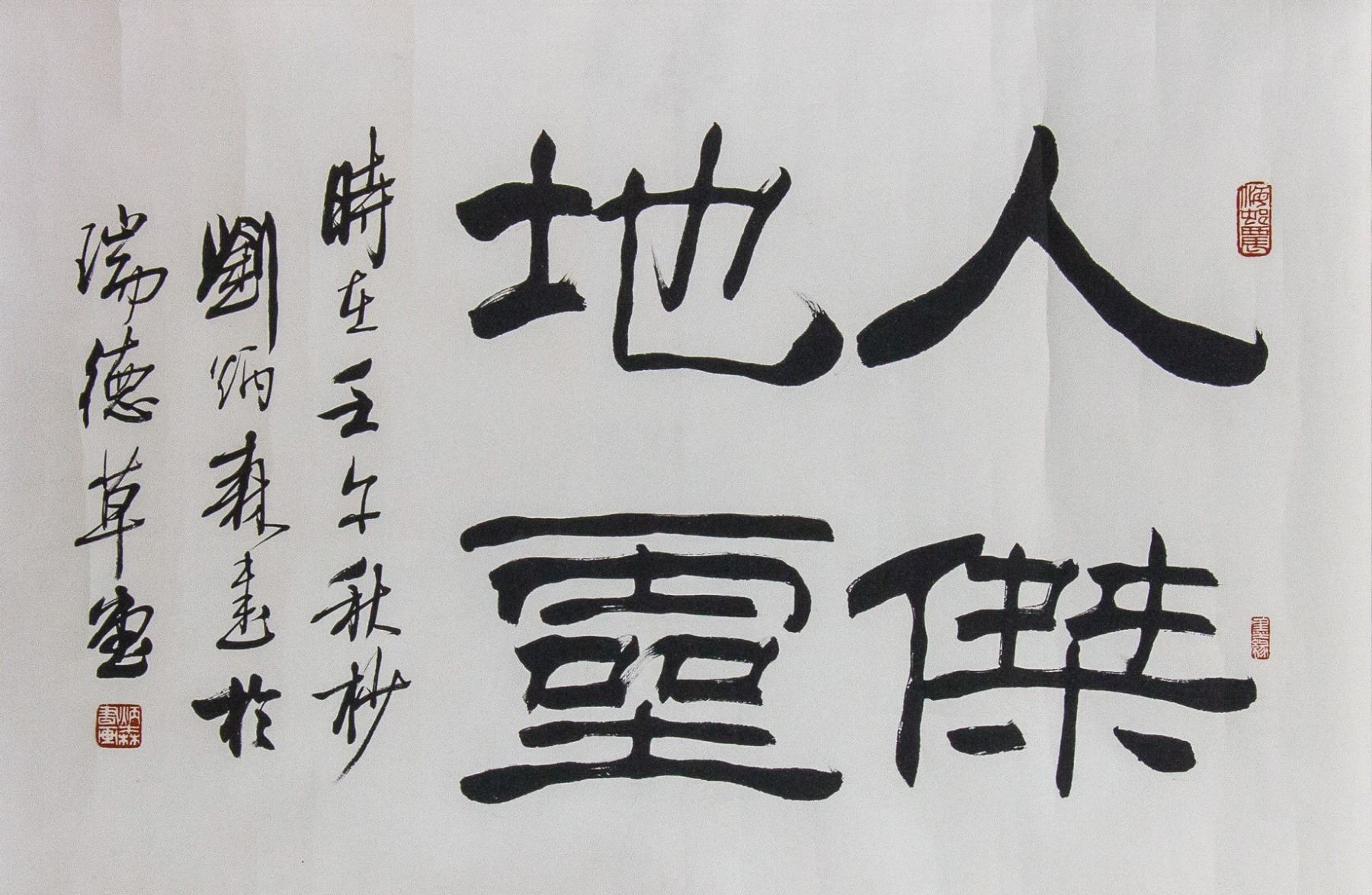 Ink on paper, Featuring clerical script calligraphy. Signed Liu Binsen 1937-2005 Chinese, inscribed with three artist seals.126 x 60 cm.