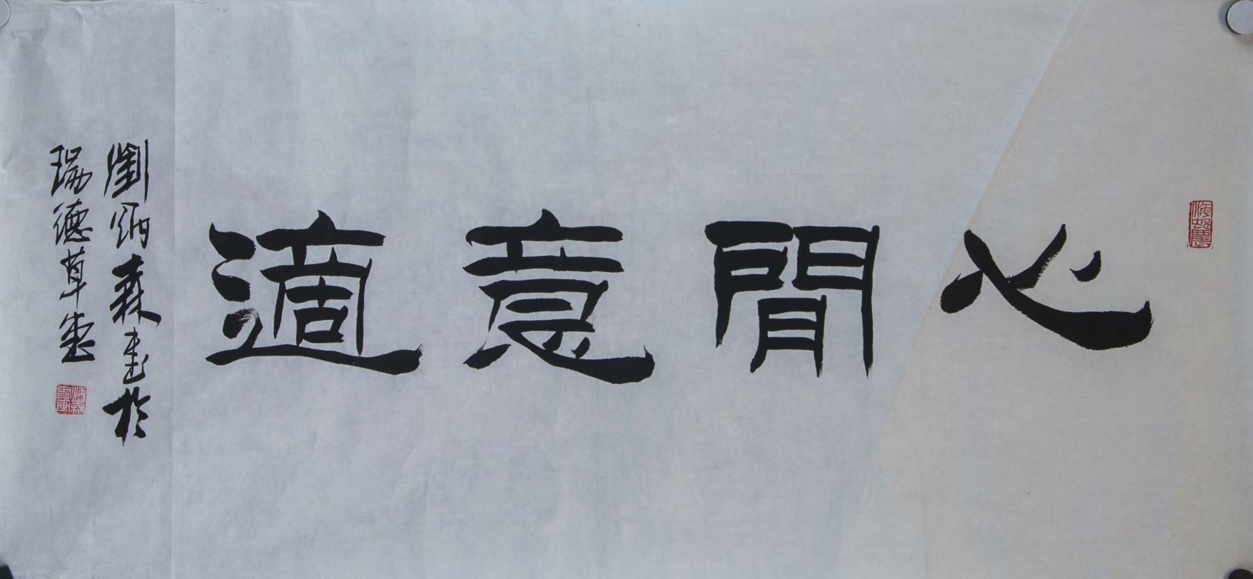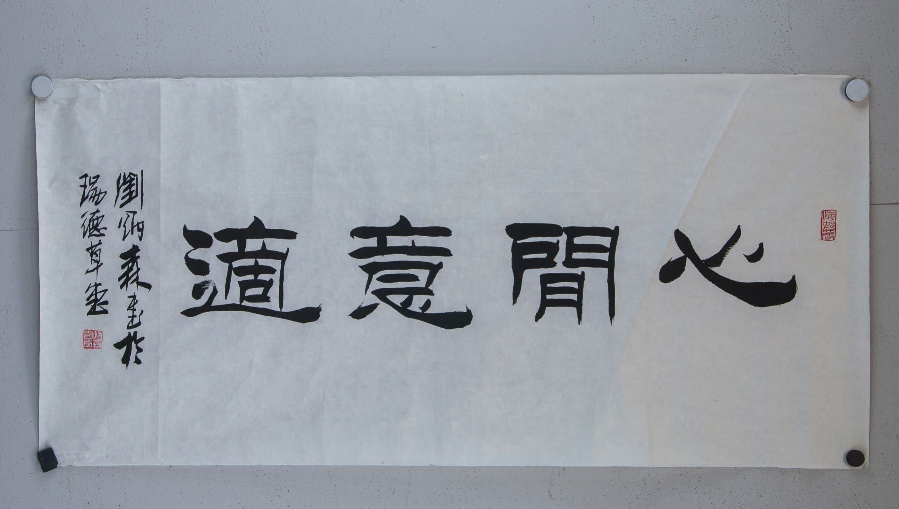 Chinese calligraphy of "Xin Xian Yi Shi"; Chinese ink on paper; signed Liu Bingsen (1937-2005); inscribed with 2 artist seals; 45 cm x 96 cm