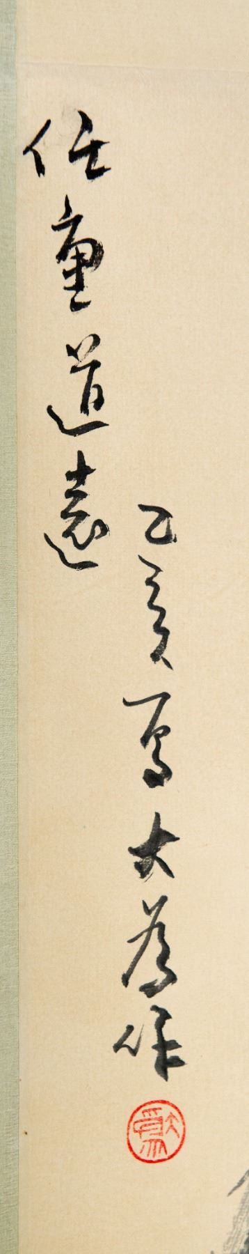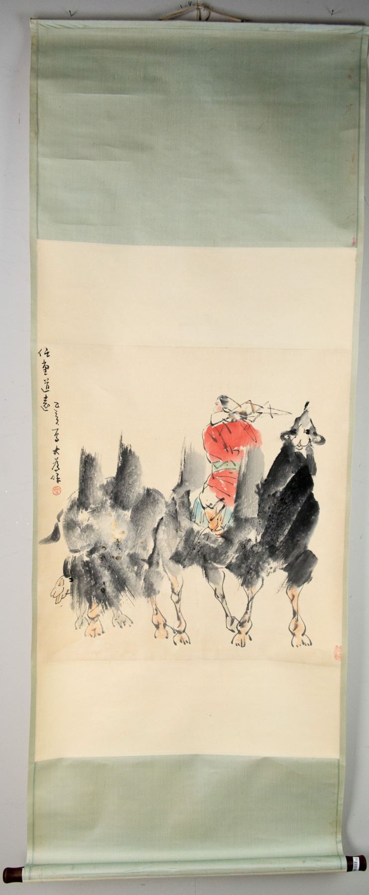Ink and watercolor on paper, anging scroll. Featuring girl and camels. Signed Liu Dawei b.1945 Chinese, inscribed with 1 artist seal. 66 x 65 cm.
