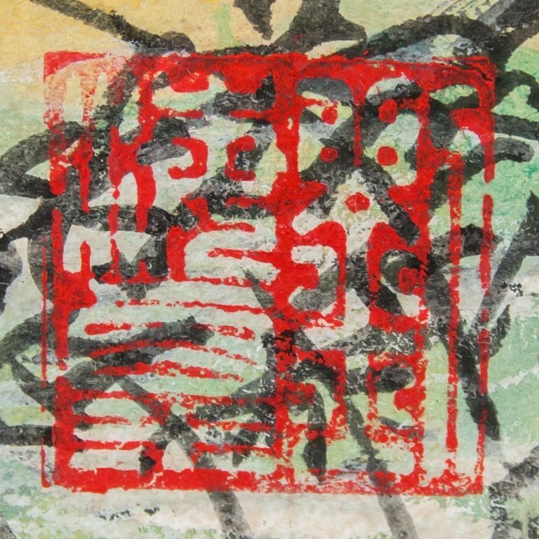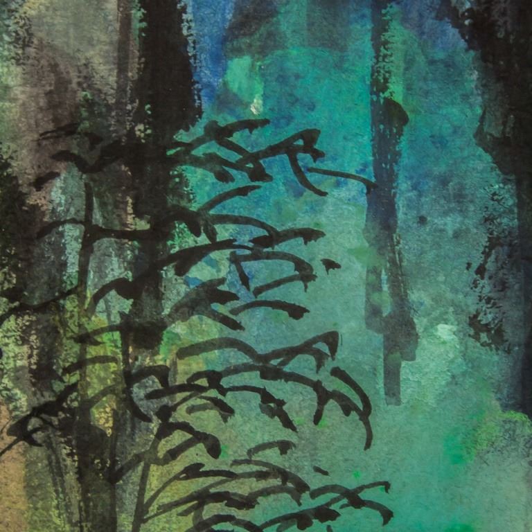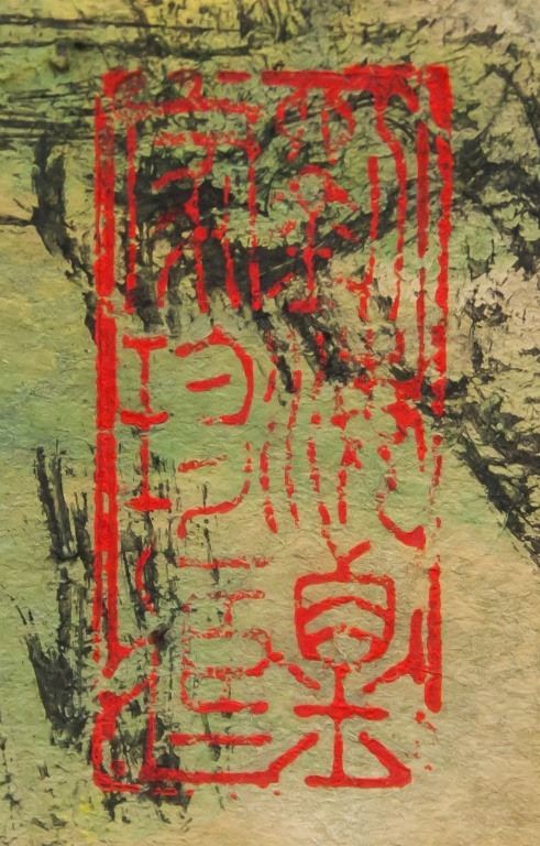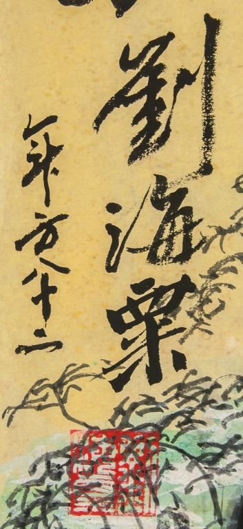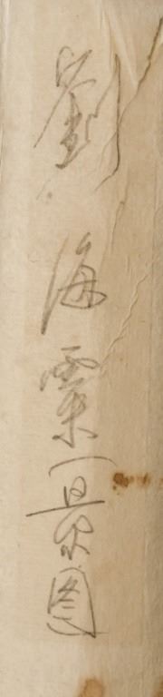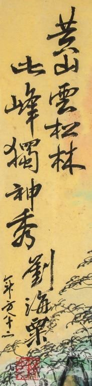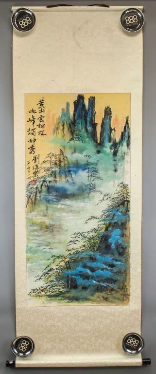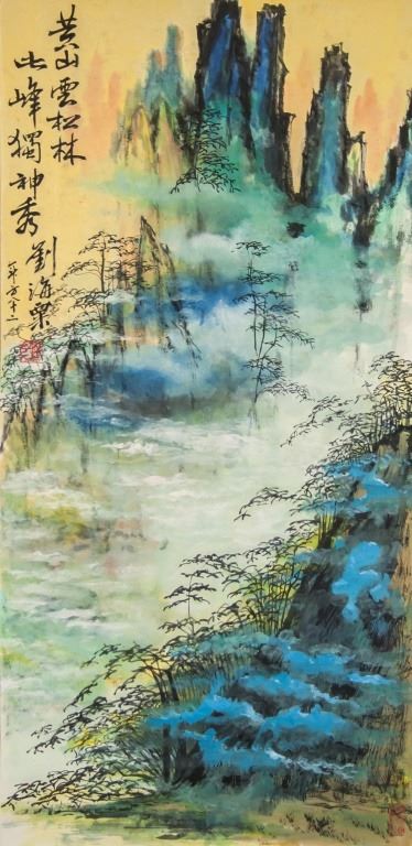 Chinese watercolor on paper. Featuring mountain scenery. Signed "Liu Haishu" to the left. Inscribed with 2 stamps. 96 x 46 cm.
