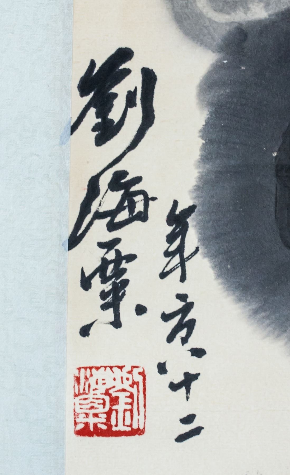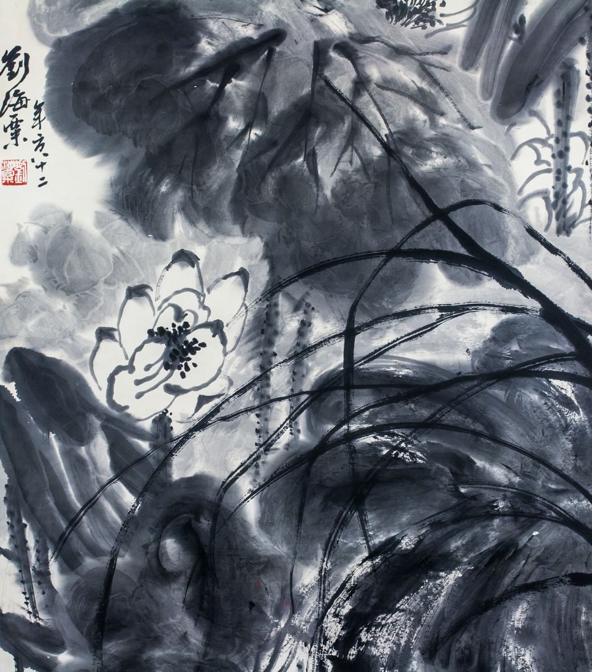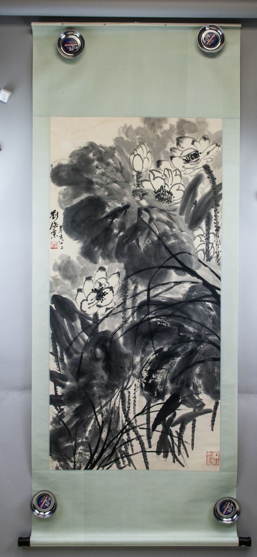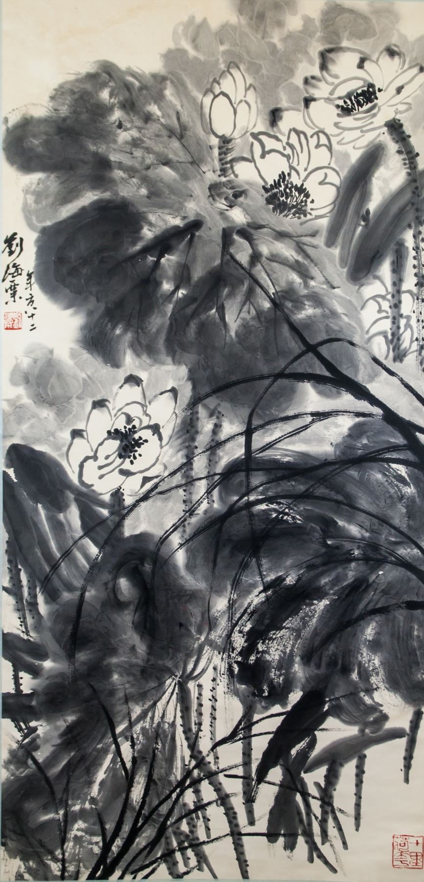 Ink on paper, hanging scroll. Featuring lotus. Signed Liu Haisu (1896-1994, Chinese), inscribed with 2 artist seals. 135 x 65 cm