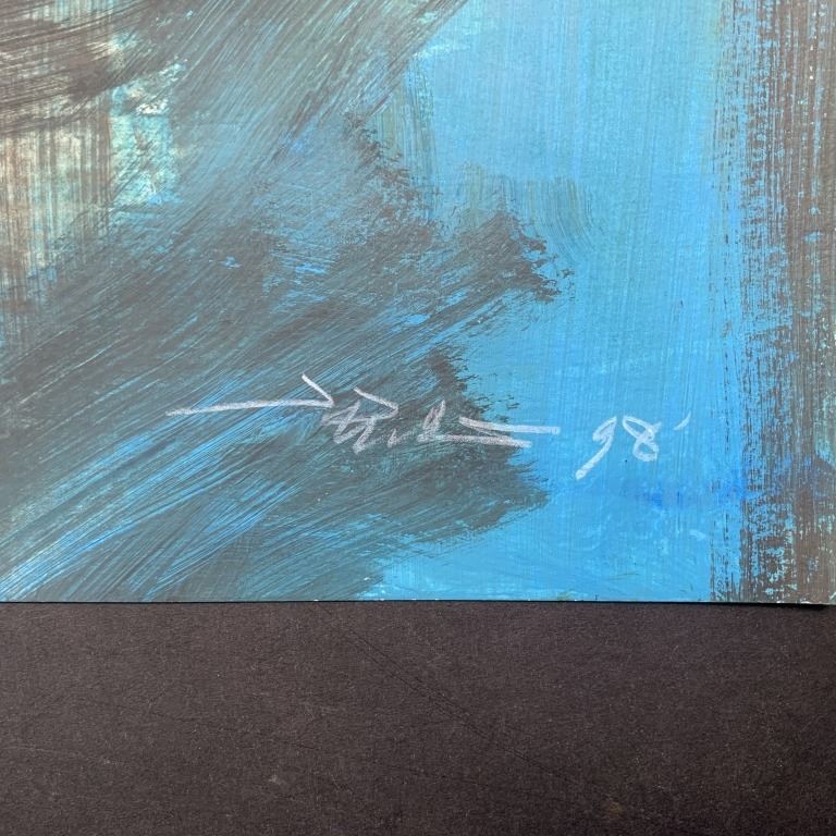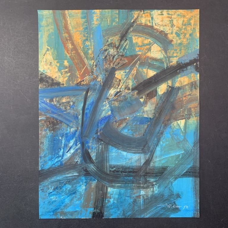 A Liu Jian original watercolour and acrylic on paper painting, circa 1998, signed and dated lower right. This piece is an abstract in blue, orange and red. This piece is in exellent condition.