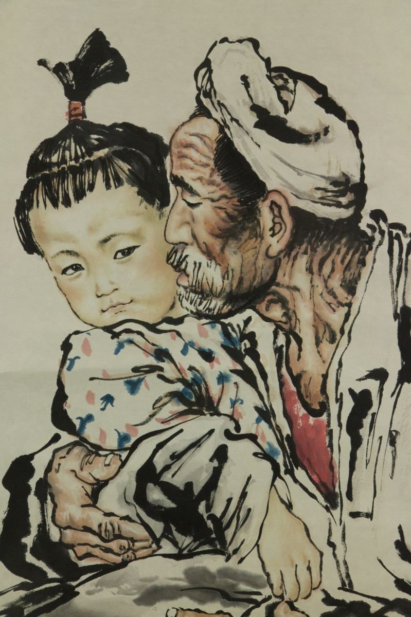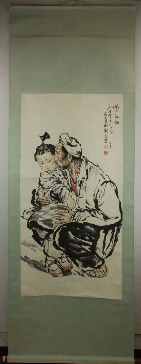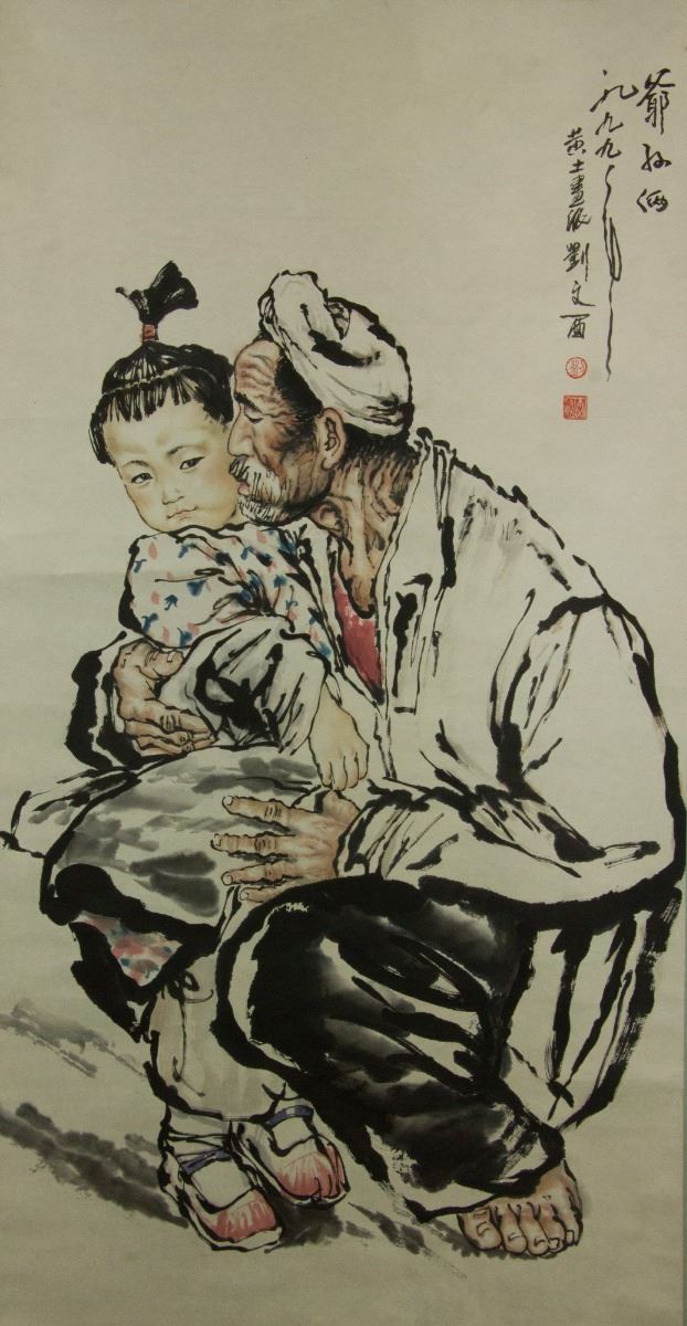 Portrait of grandfather and his granddaughter; Chinese ink and watercolour on paper; hanging scroll; signed Liu Wenxi (b.1933); inscribed with 2 artist seals; 128 cm × 63.5 cm