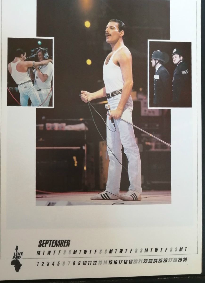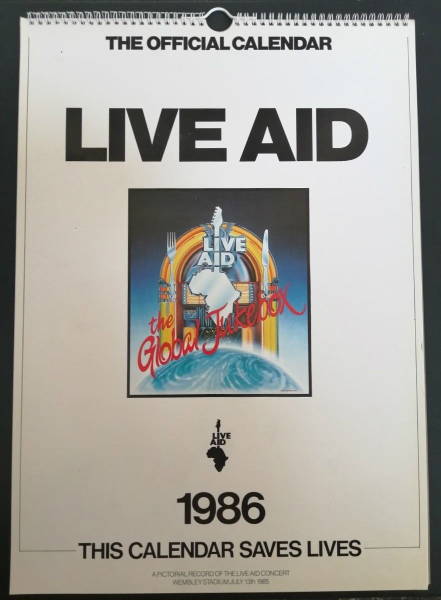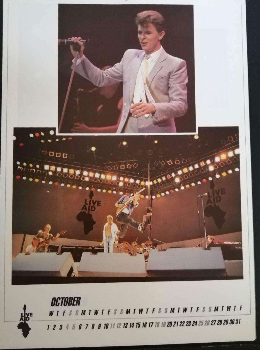 UK 12" x 16" spiral-bound colour calendar featuring a pictorial record from the Live Aid concert at Wembley Stadium on July 13th 1985. Featuring photos of David Bowie, Freddie Mercury, George Michael among others.