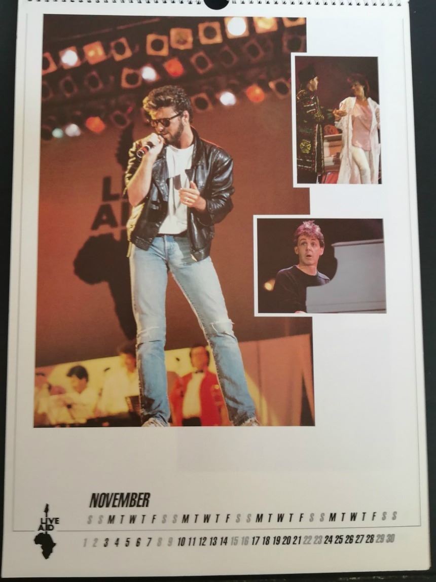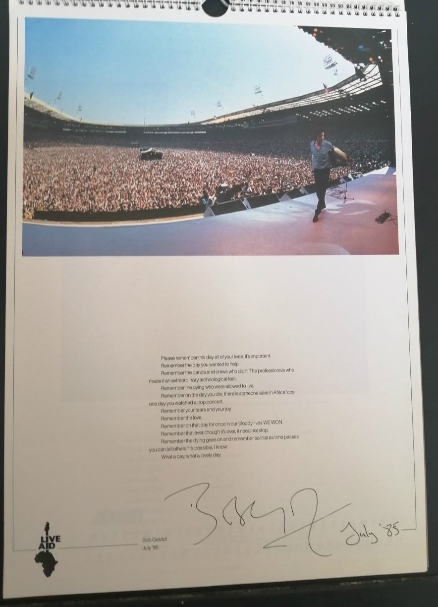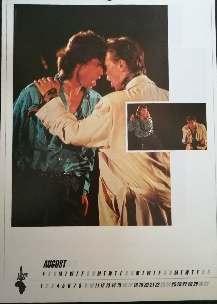 UK 12" x 16" spiral-bound colour calendar featuring a pictorial record from the Live Aid concert at Wembley Stadium on July 13th 1985. Featuring photos of David Bowie, Freddie Mercury, George Michael among others.