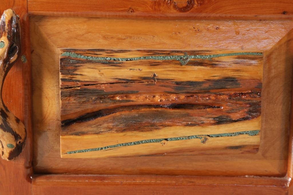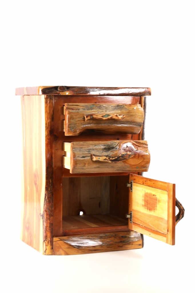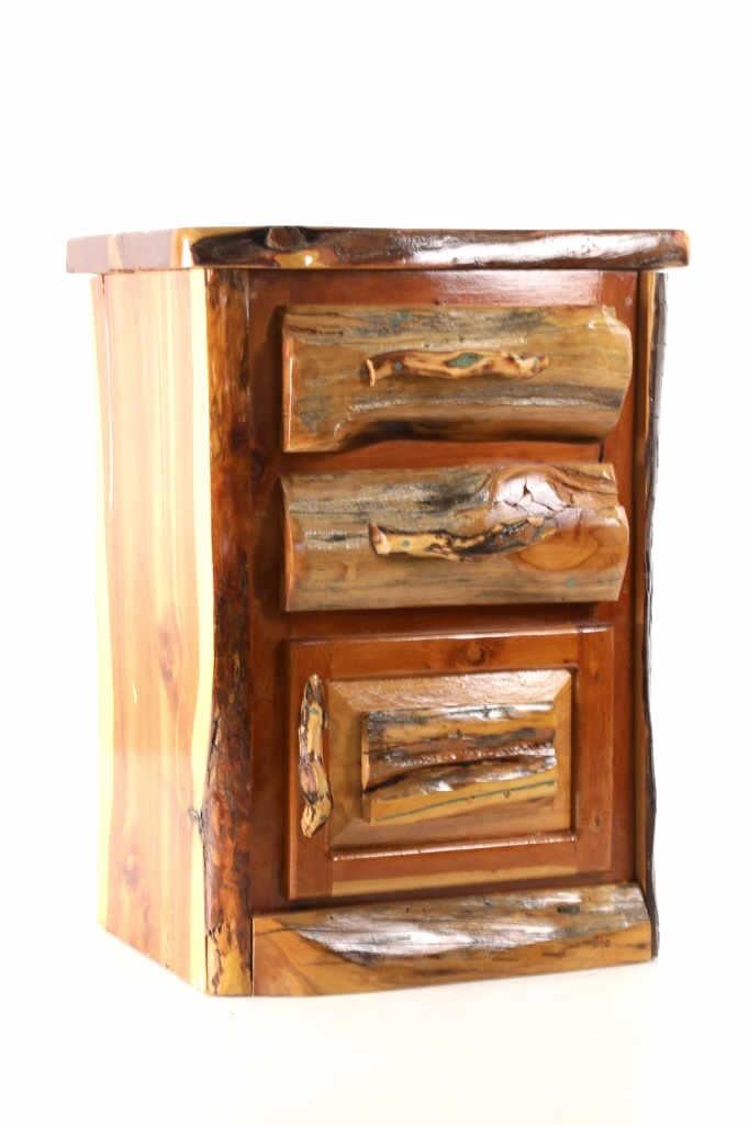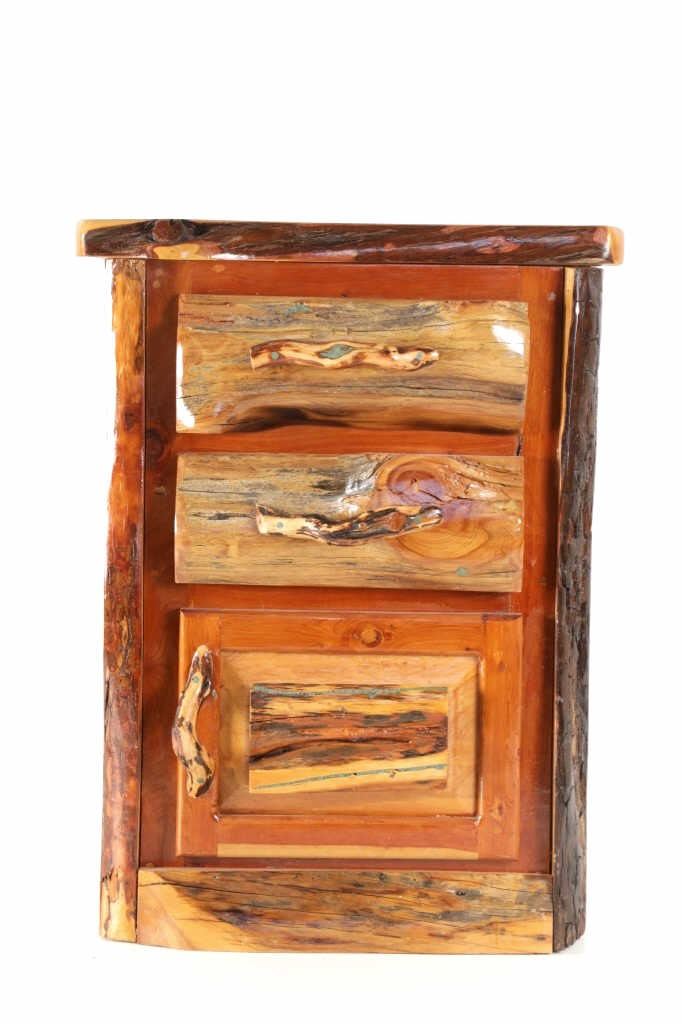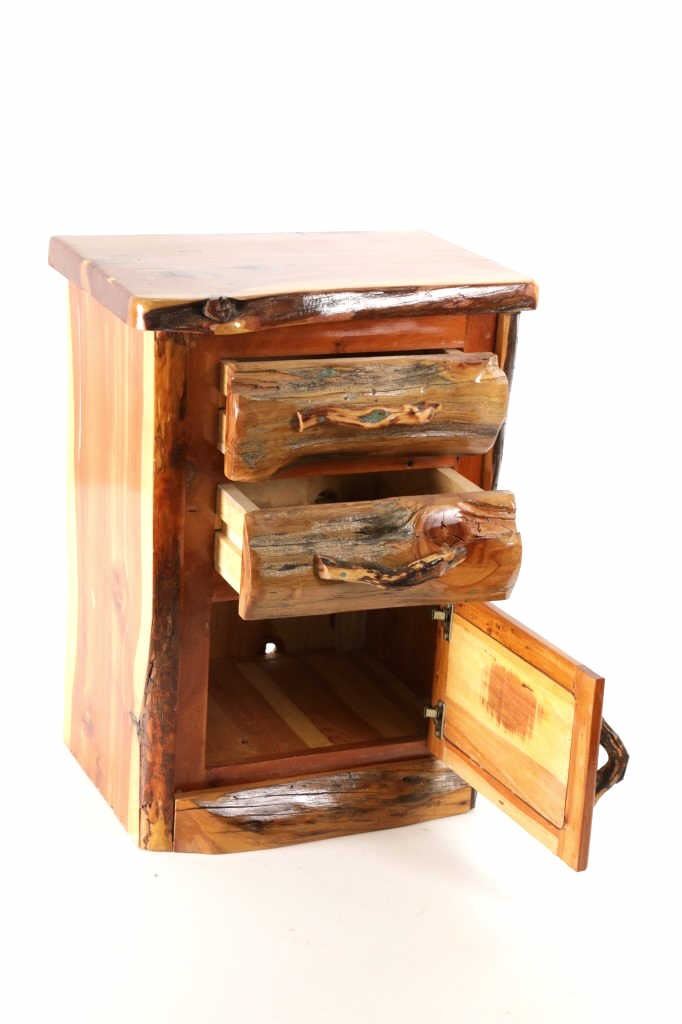 Featured in this lot is this live edge burl wood, night stand cabinet from the late 20th century. This night stand cabinet shows a beautiful wood construction showing burl wood and live edge throughout. It features two pull out drawers on the top and a cabinet on the bottom. Crushed turquoise inlay can be seen throughout the cabinet, in small sections, giving a nice light blue / teal contrast to the wood. It is stamped on the back reading, "Hecho En Mexico". The cabinet shows good condition overall with slight to no wear present. No major signs of damage is noted. It measures 18 3/4" L x 24" W x 32" H.