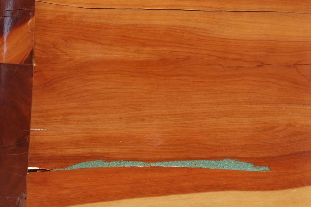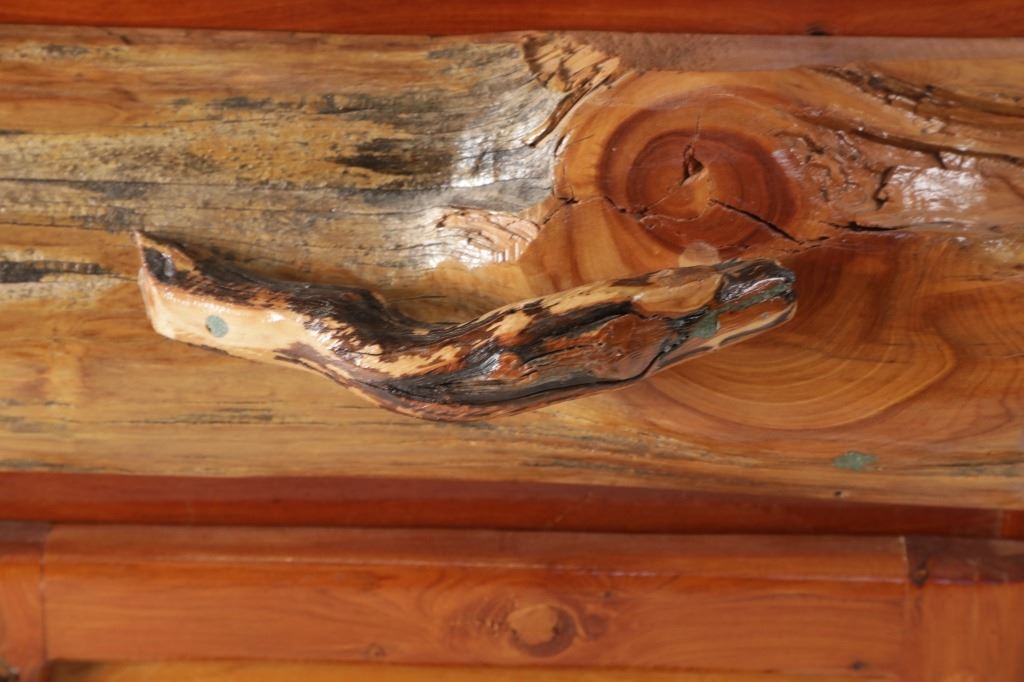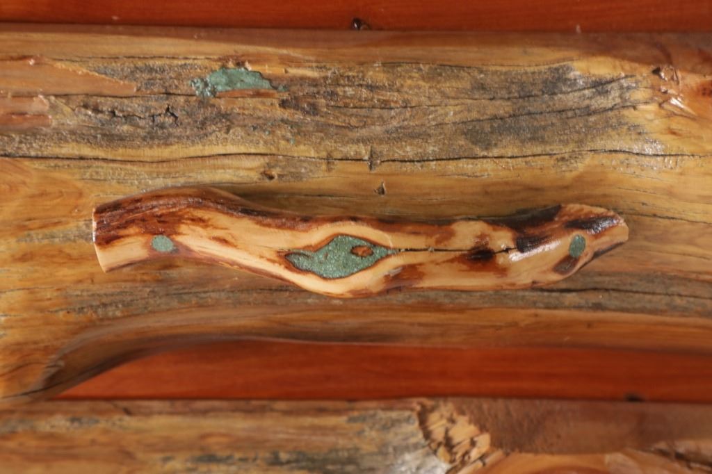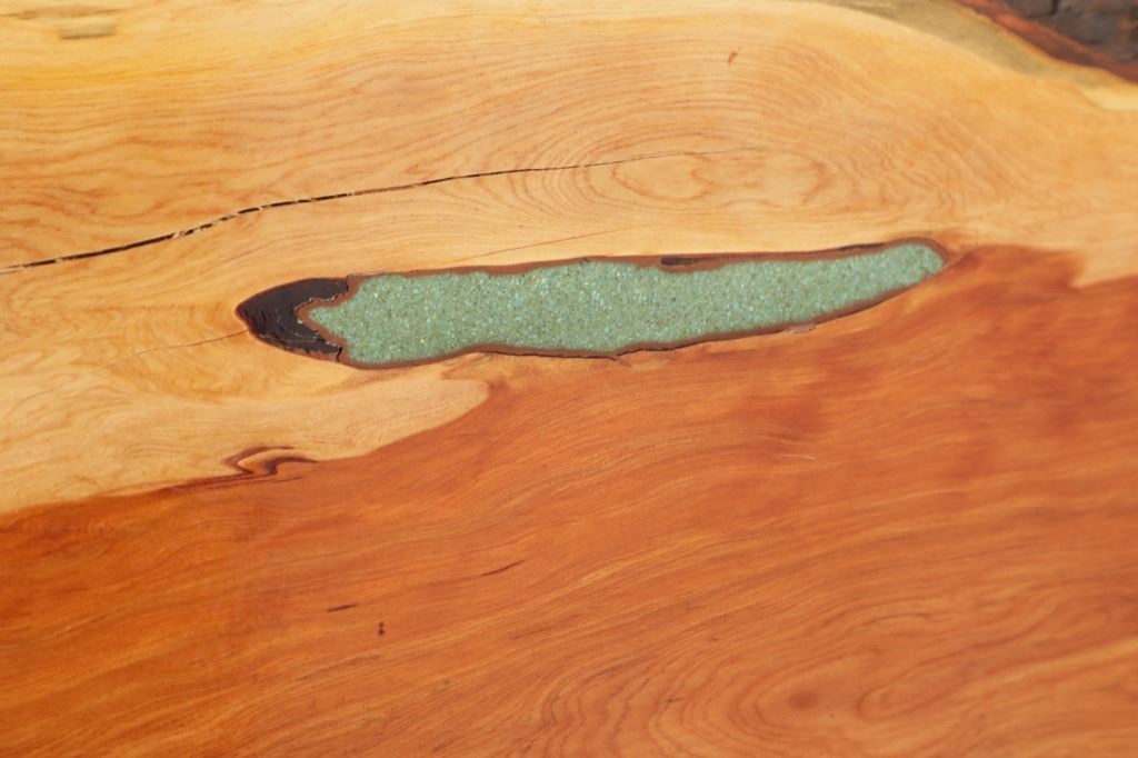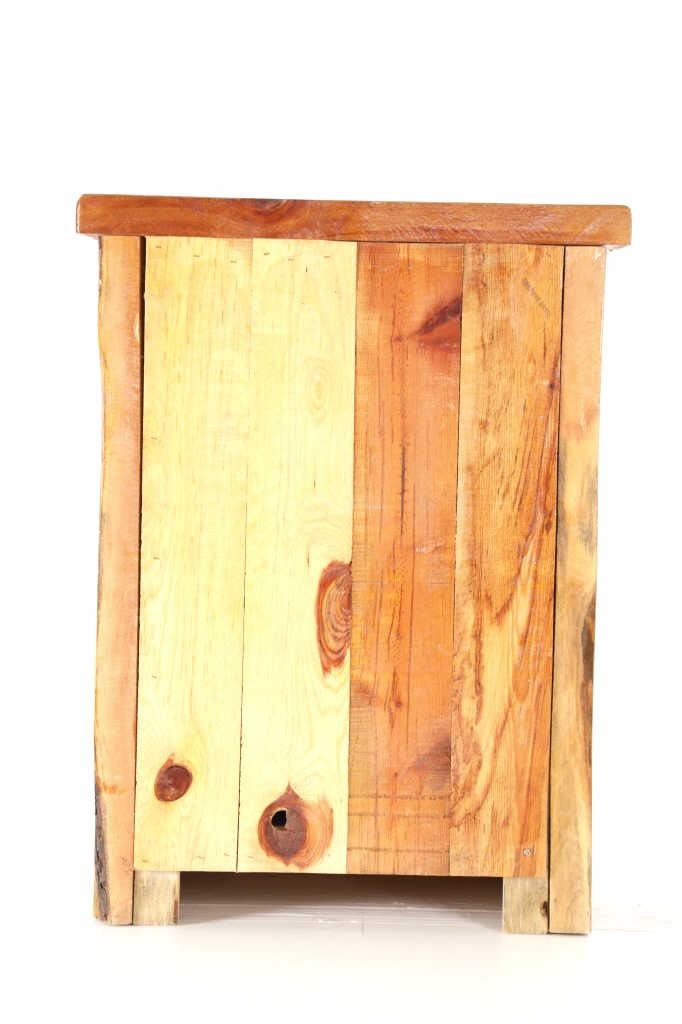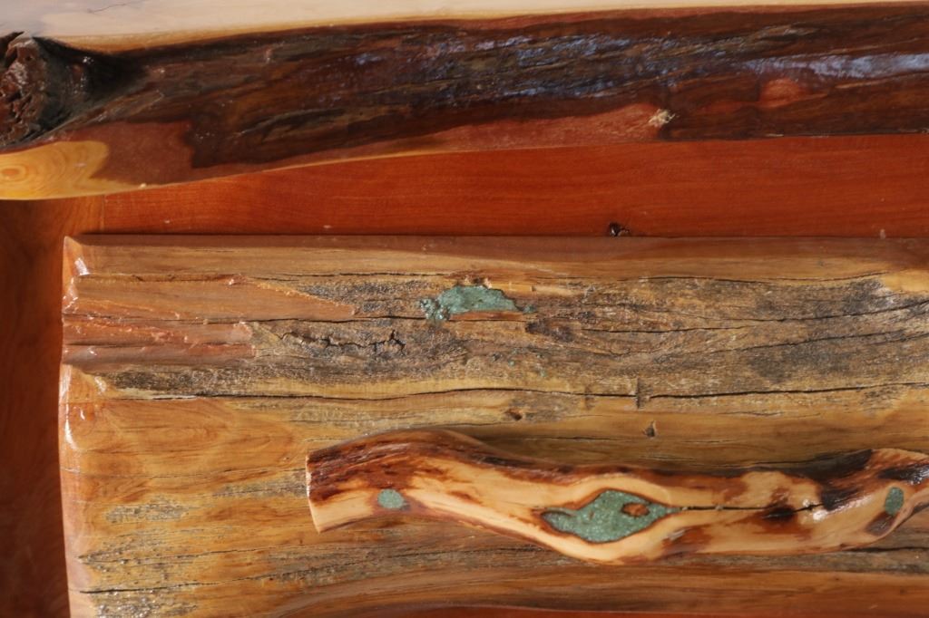 Featured in this lot is this live edge burl wood, night stand cabinet from the late 20th century. This night stand cabinet shows a beautiful wood construction showing burl wood and live edge throughout. It features two pull out drawers on the top and a cabinet on the bottom. Crushed turquoise inlay can be seen throughout the cabinet, in small sections, giving a nice light blue / teal contrast to the wood. It is stamped on the back reading, "Hecho En Mexico". The cabinet shows good condition overall with slight to no wear present. No major signs of damage is noted. It measures 18 3/4" L x 24" W x 32" H.