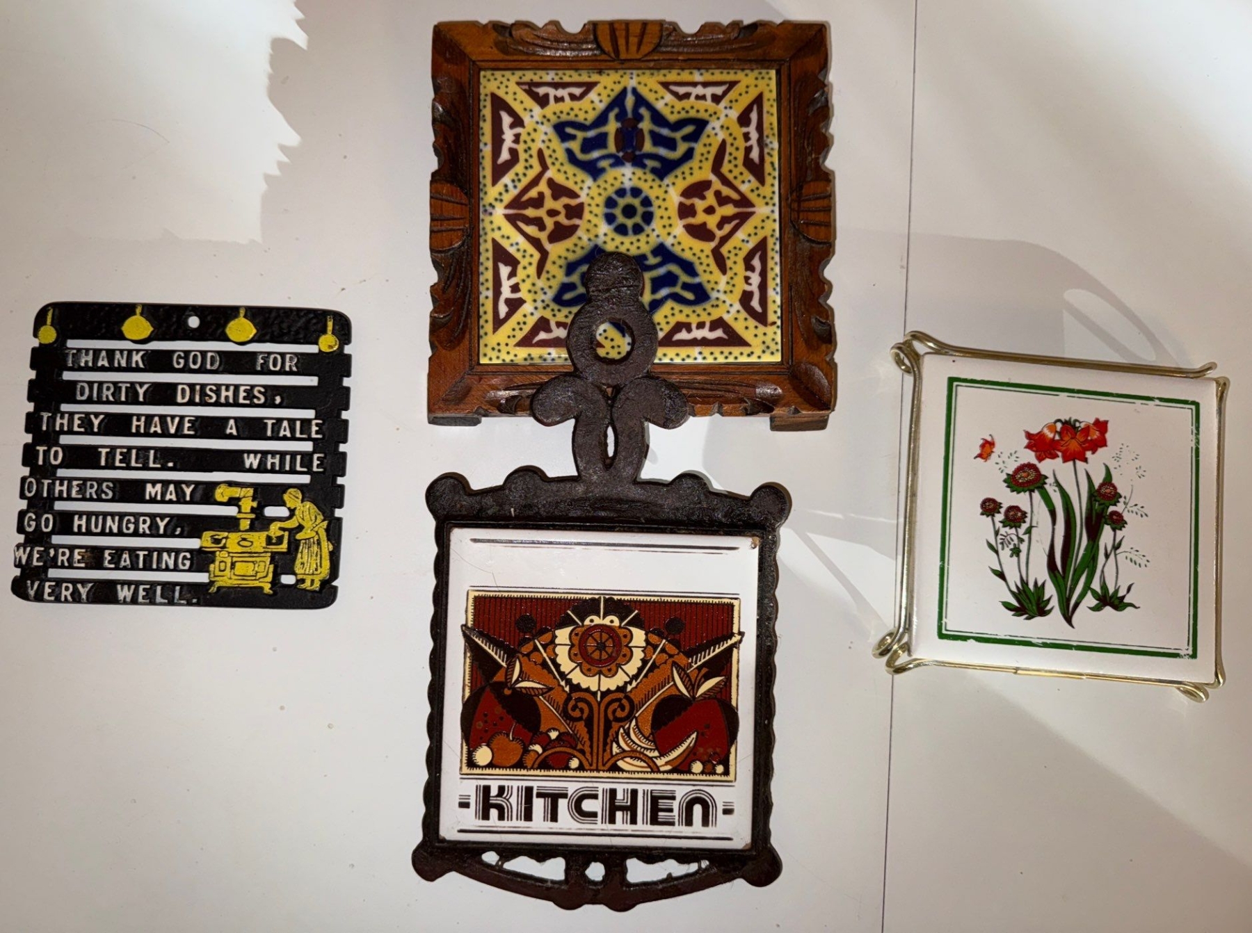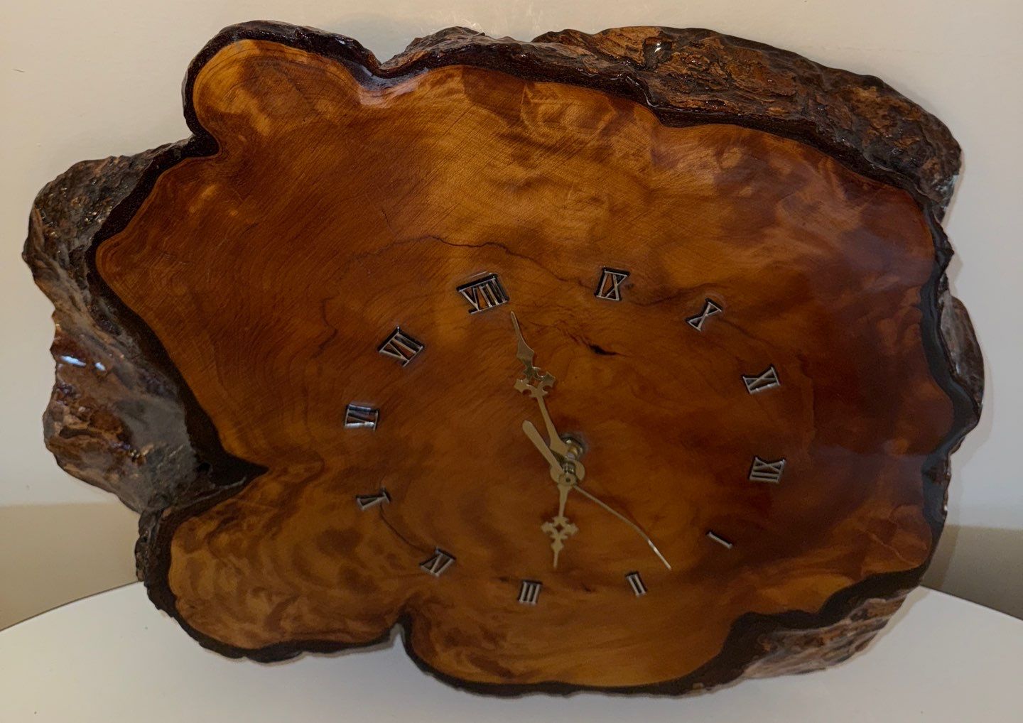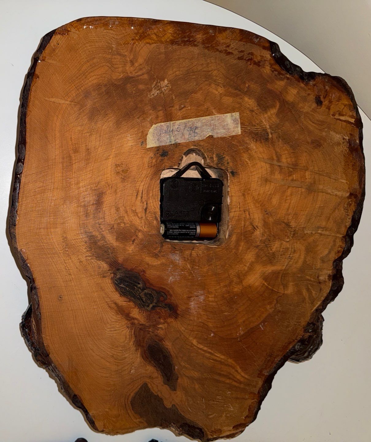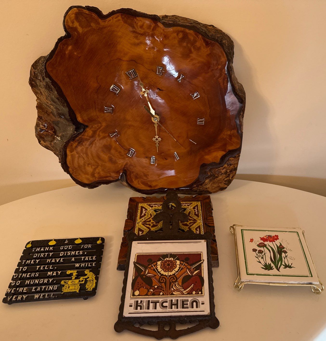 Live Edge Polished Wood Slab Wall Clock-Burl Wood & Multiple Vintage Trivets