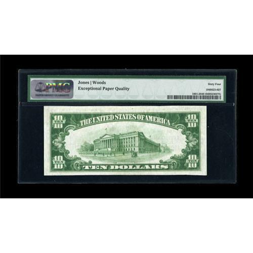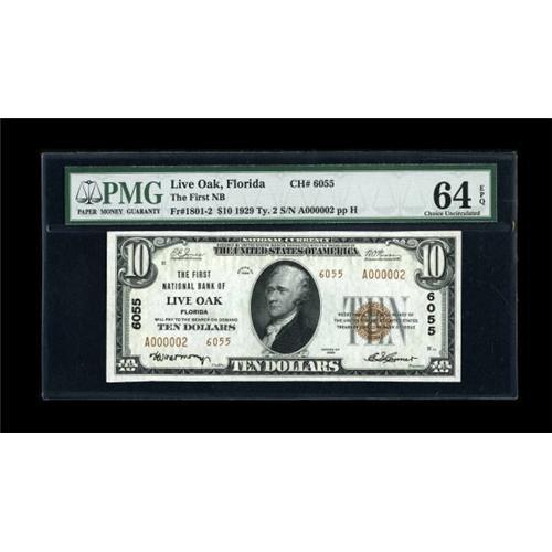 <B>Live Oak, FL</B></I> - $10 1929 Ty. 2 <B>The First NB</B></I> Ch. # 6055<BR> A lovely note from a much in demand bank bearing single digit serial number A000002 as a bonus. This piece was last on the market over twenty years ago in a June, 1987 Hickman-Oakes sale. We sold a Very Fine small Live Oak note for over $4000 in 2006, making any estimate here somewhat uncertain, but we would expect this PMG graded <B>Choice Uncirculated 64 EPQ</B></I> beauty to easily reach and perhaps well exceed...<BR><I>From The Sunshine State Collection.</B></I><BR><BR><b>Shipping:</b> Coins & Currency (<a target="_blank" href="http://www.heritageauctions.com/common/shipping.php">view shipping information</a>)