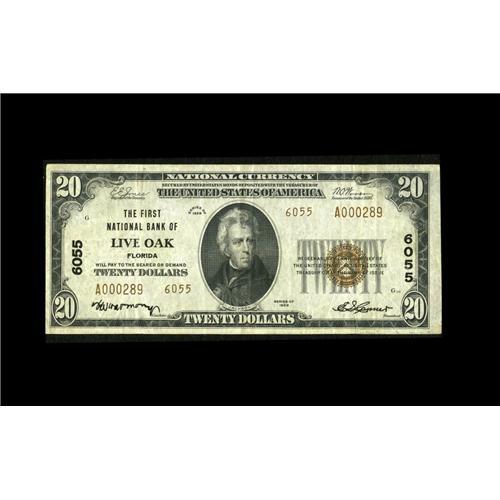 <B>Live Oak, FL</B></I> - $20 1929 Ty. 2 <B>The First NB</B></I> Ch. # 6055<BR>A relatively small number of survivors are known from this bank, though over $800,000 in National Bank Notes were originally issued. On the whole, attrition in Florida was severe, with a limited number of banks and an exploding population beginning in the 1920's. This piece is only the second Type 2 Twenty available outside an uncut sheet of notes. The paper is wholly original and the overall eye appeal is excellent. <B>Very Fine.</B></I>