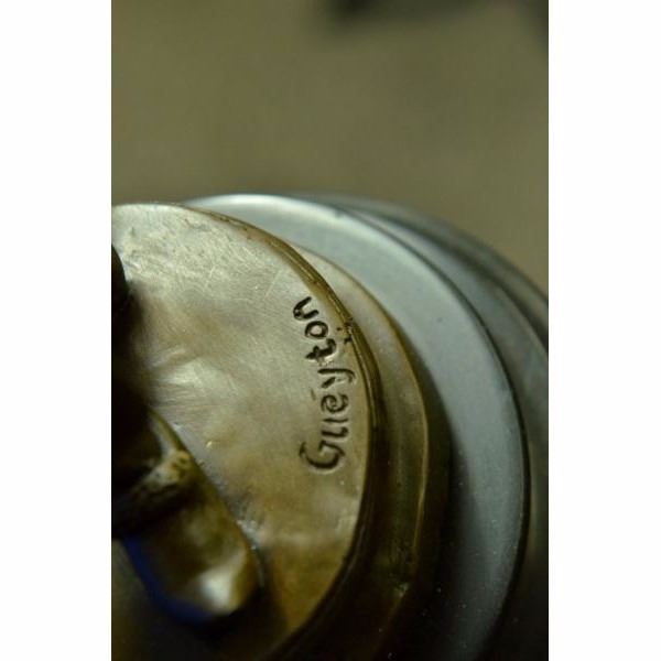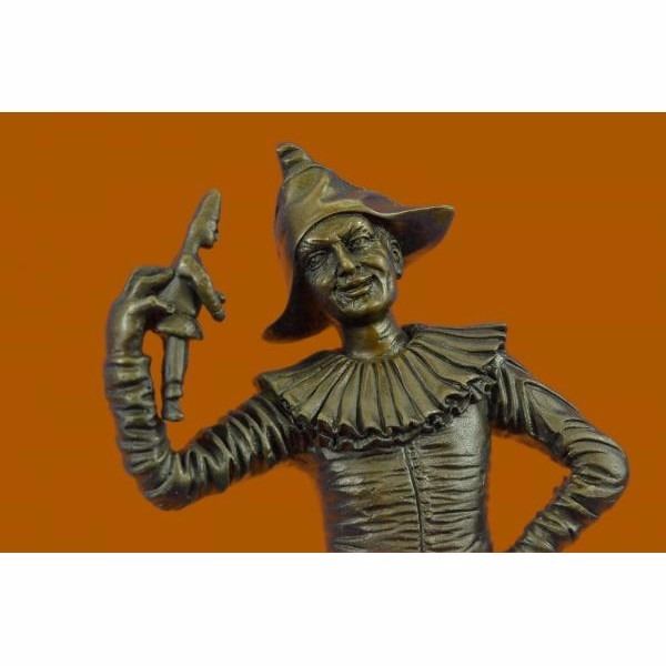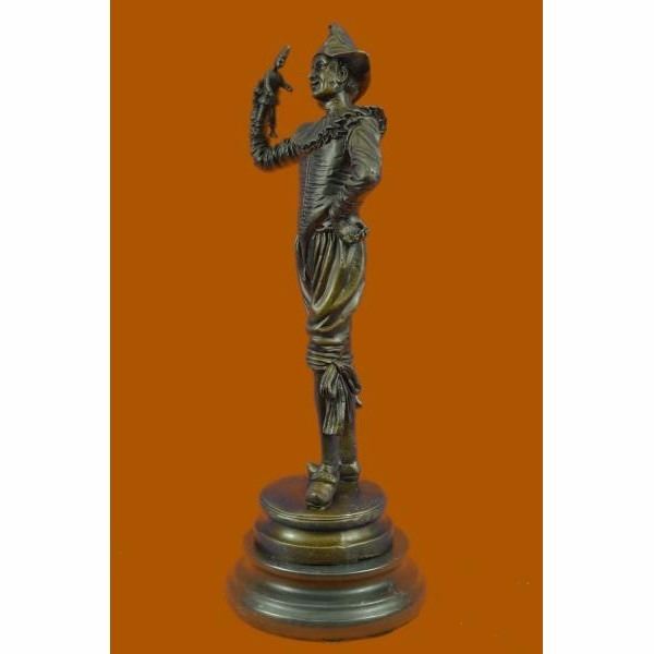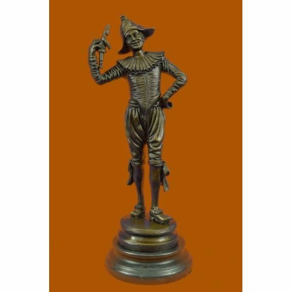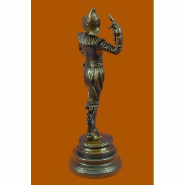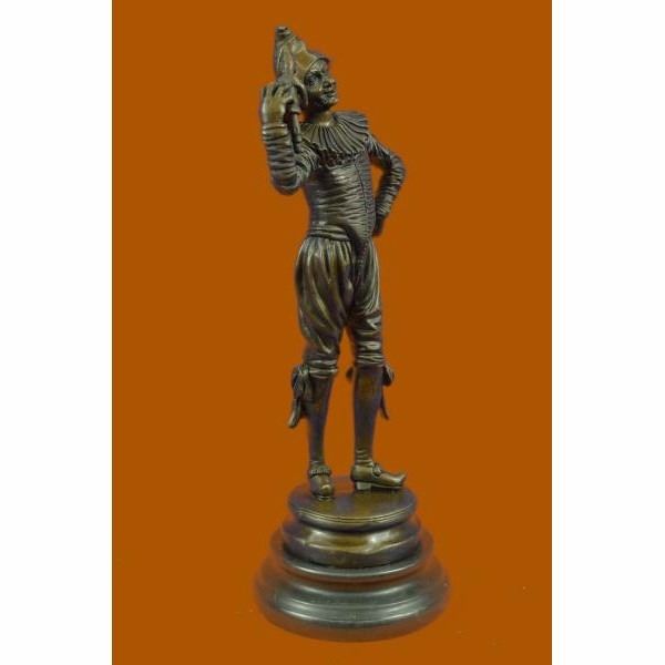 This lively dancing jester is depicted in the Art Deco style inspired by the work of the prominent sculptor Gueyton . Hunched backed jester claims immunity to the jibes of his hunchbacked zany. Often these clever, royal clowns would exert great influence on their patrons, and Add a wonderful touch to any space. The handmade bronze sculpture was molded using the ancient method of lost-wax casting and with skin tones stained with a brown patina finish for preservation. It is mounted upon a black marble base with the European Bronze Finery stamp of quality and the artist Gueyton's signature. Condition: This sculpture is in perfect condition. Bronze Dimensions with Marble Base:Height 14" x Width 5" Marble Dimensions:Diameter 5" Height without base: 13" Weight :7 LBS Inventory : 69FT0316096