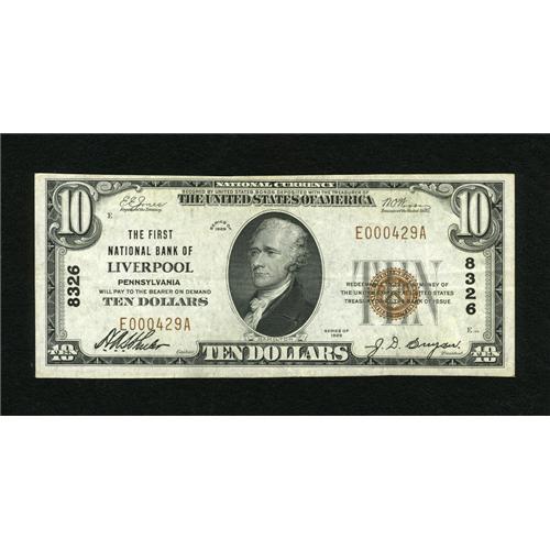 <B>Liverpool, PA</B></I> - $10 1929 Ty. 1 <B>The First NB</B></I> Ch. # 8326<BR>This wholly original piece has one more fold than a EF should. <B>Very Fine.</B></I><BR><BR><b>Shipping:</b> Coins & Currency (<a target="_blank" href="http://www.heritageauctions.com/common/shipping.php">view shipping information</a>)