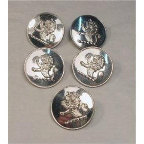 Five old livery buttons - worn by servants on their livery, and bearing the crest of the household (Lion Rampant over bar in this case). Fronts are silvered metal, and the rear of the buttons are coppery looking. They are stamped with the maker?s name: ?R.E.Hayward, 21 Bouverie St, London?. Buttons are 26 mm diameter (1 inch) and have loop backs. We have 5 smaller identical buttons for sale elsewhere in this category. Excellent condition.