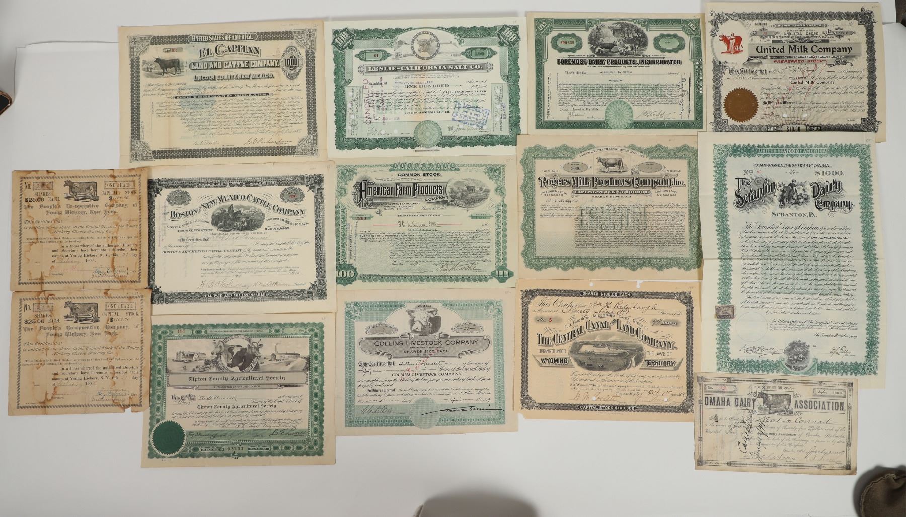 Lot of 14 . I/U, I/C. VG or better. I.E.; Collins Livestock Co., The Scranton Dairy Co. 5%, $1000 bond., Leslie-California Salt CO., Omaha Dairy Assoc. The Boston and New Mexico Cattle Co.