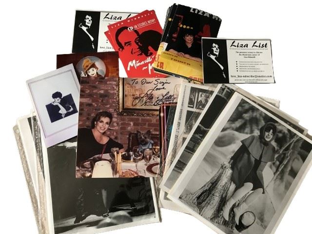 A collection of Liza Minnelli memorabilia including personal photographs of her at a signing at tower records to postcards promoting Minnelli and Minnelli live at the palace cd, a postcard promoting a Liza Minnelli fan Internet forum, and 15 Black and white 8 x 10“ photos of Liza on the set of New York New York, with Halston, on the Ed Sullivan show celebrating her entertainer of the year award, at the Hollywood Palace, on the Carol Burnett show, in a performance with Mikhail Baryshnikov on Broadway. Dated from the 1960s to 70s.