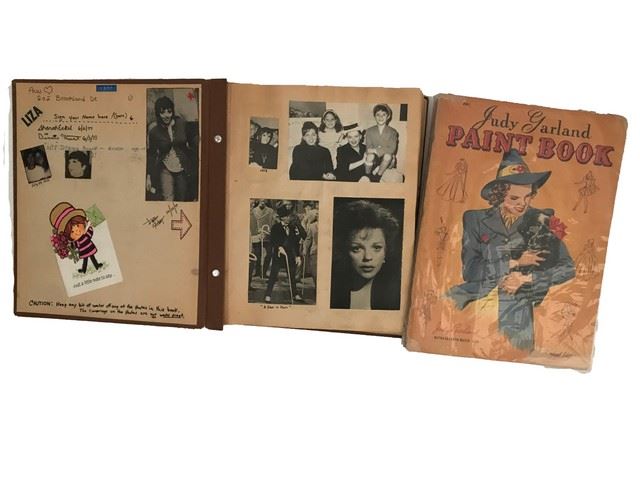 A comprehensive and memorable collection in a scrapbook of newspaper clippings and magazine covers all related to Liza Minnelli and her life in Hollywood on and off the stage. Also included, but not pictured is a beautiful drawing of Judy Garland drawn by Ann Hart (a fan) made in 1977. Also included is a sealed Judy Garland vintage Paint Book.